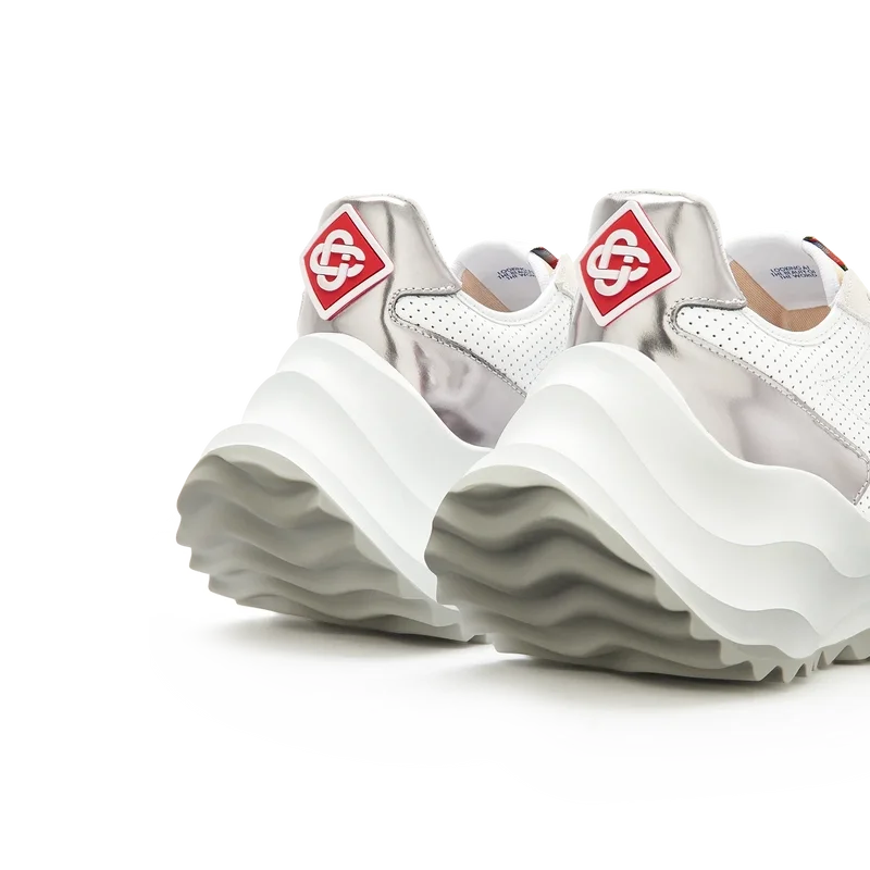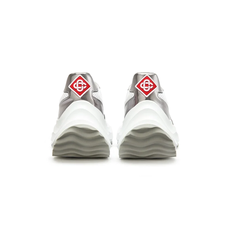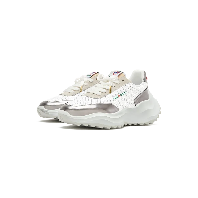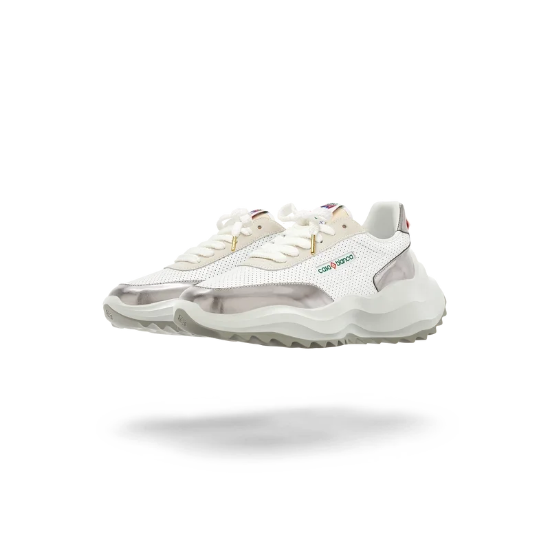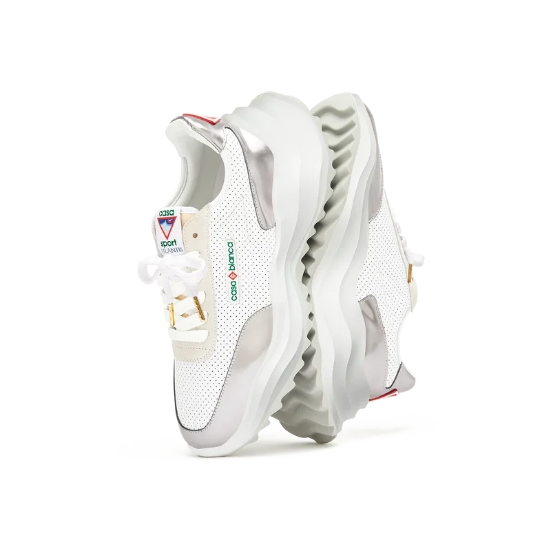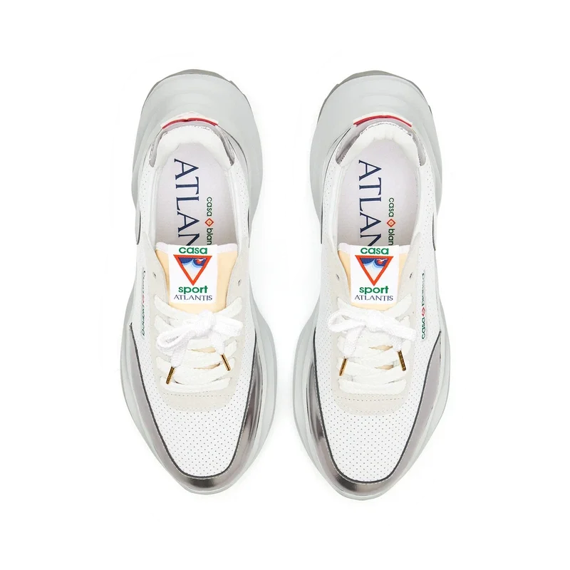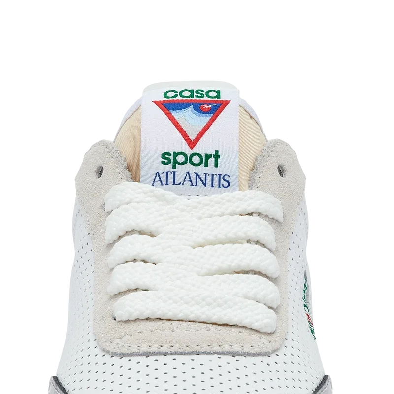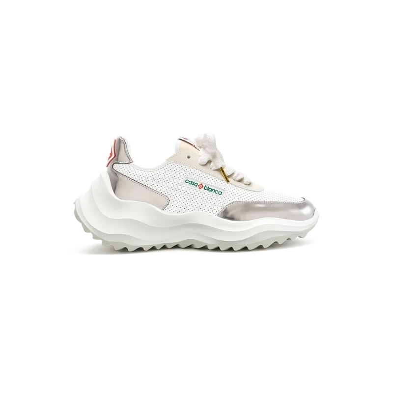 Empiècements en cuir verni chromé ton sur ton, tige en cuir perforé, lacets en daim contrasté, patch en caoutchouc Casablanca Diamond sur la languette du talon, languette Casa Sport tissée sur le panneau latéral, étiquette Atlantis tissée sur la languette, semelle intermédiaire sculptée en EVA Wave, semelle extérieure en caoutchouc, embouts de lacets dorés