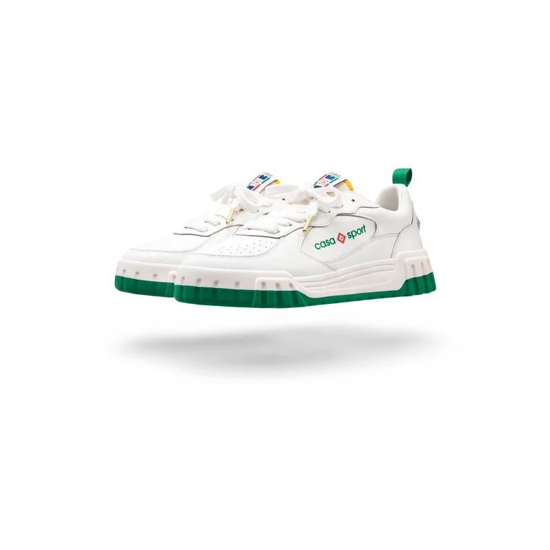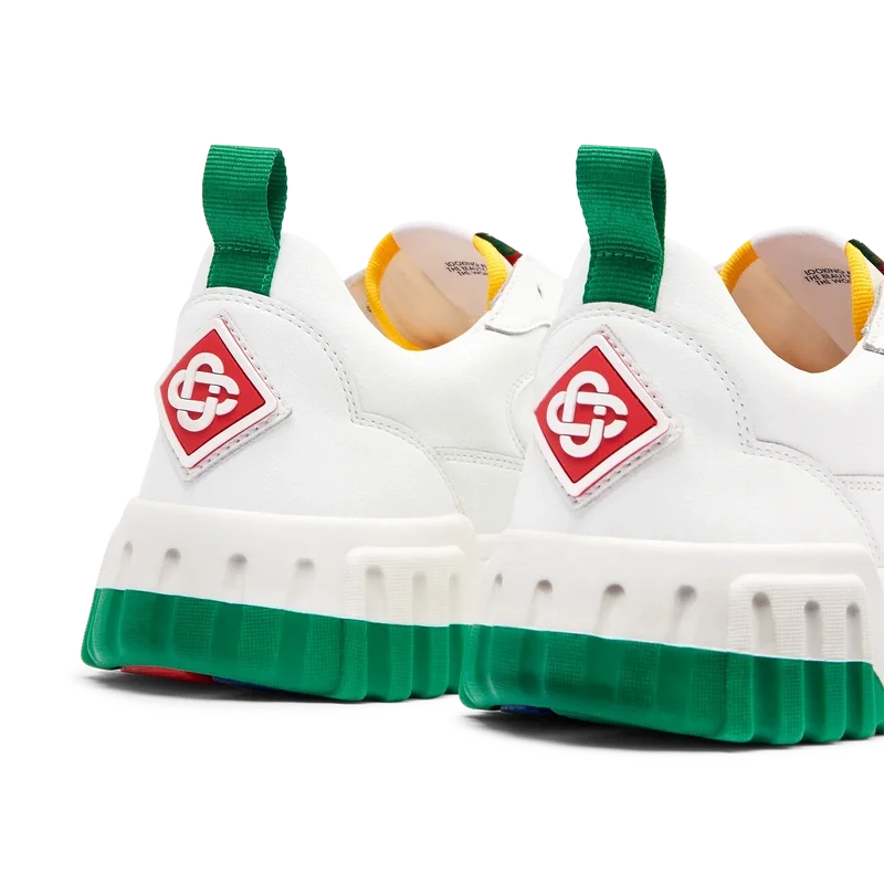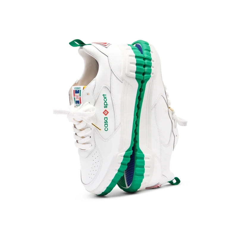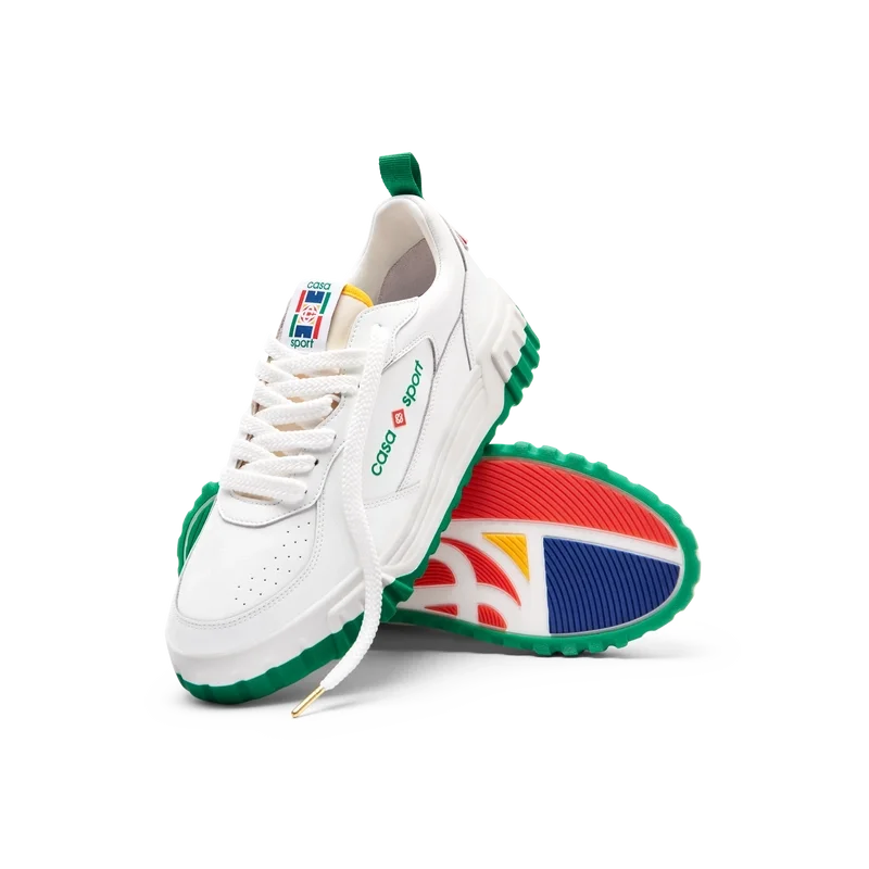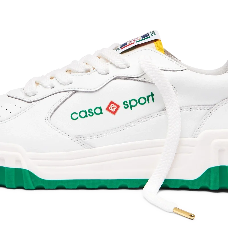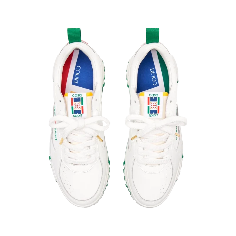 La tige de la chaussure présente des lignes fluides et intégrées, en clin d’œil aux silhouettes emblématiques des années 90. Le logo Casa Sport est bien visible partout, notamment grâce au motif en losange signature de la marque sur le talon, au logo en silicone sur les panneaux latéraux, ainsi qu’à l’étiquette tissée sur la languette et à la semelle intérieure représentant un court de tennis, d’où le nom de la chaussure, la Court.