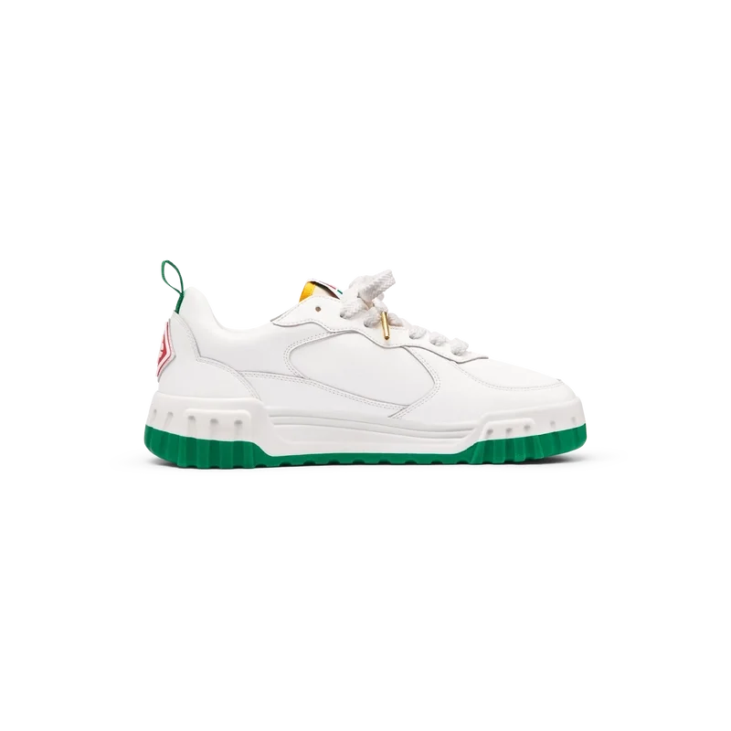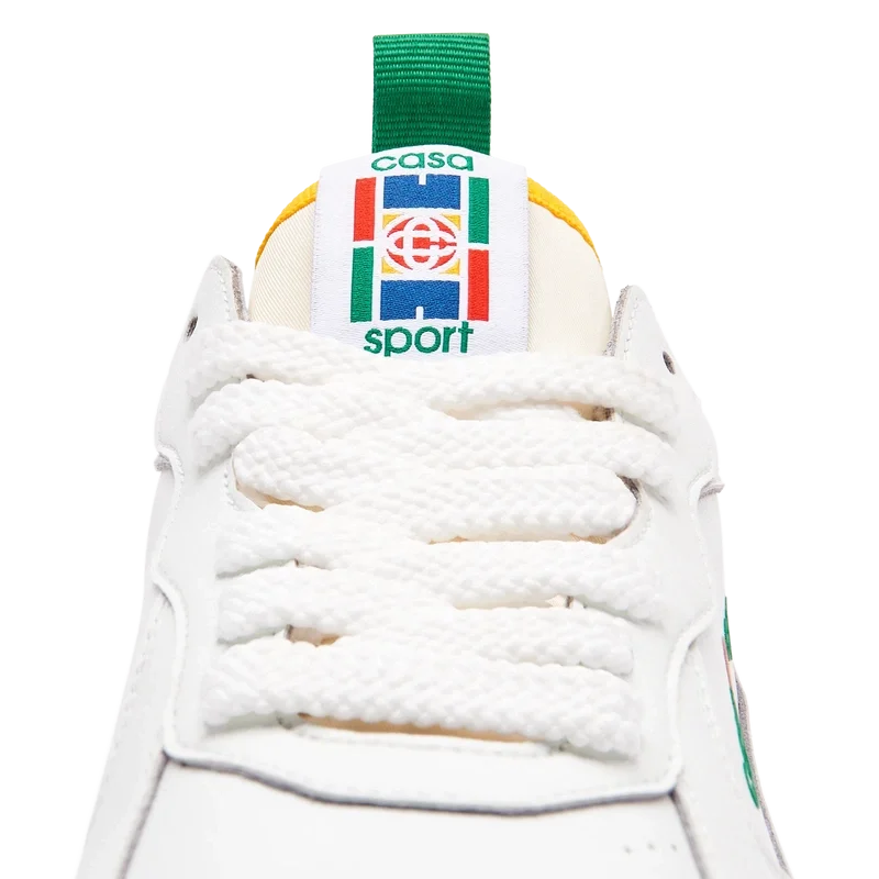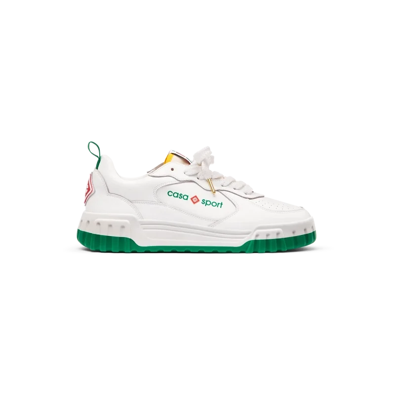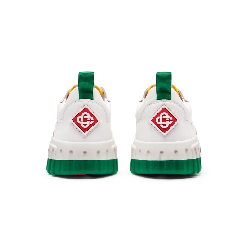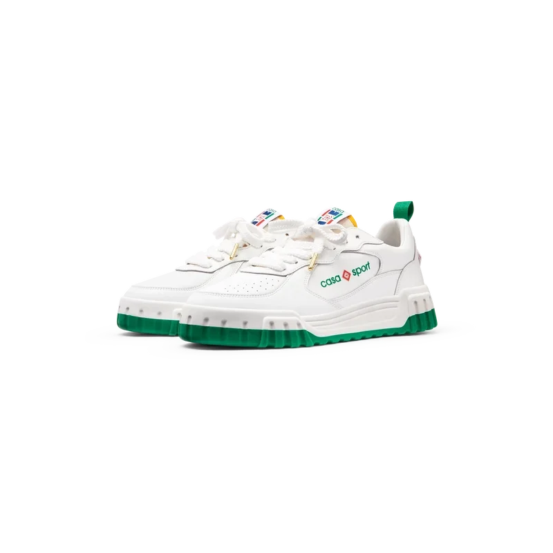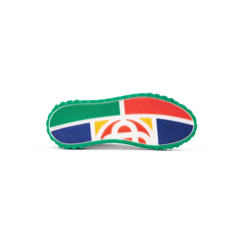 La tige de la chaussure présente des lignes fluides et intégrées, en clin d’œil aux silhouettes emblématiques des années 90. Le logo Casa Sport est bien visible partout, notamment grâce au motif en losange signature de la marque sur le talon, au logo en silicone sur les panneaux latéraux, ainsi qu’à l’étiquette tissée sur la languette et à la semelle intérieure représentant un court de tennis, d’où le nom de la chaussure, la Court.