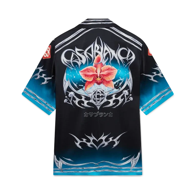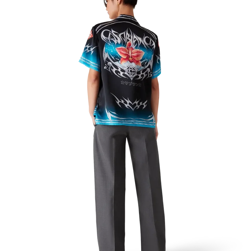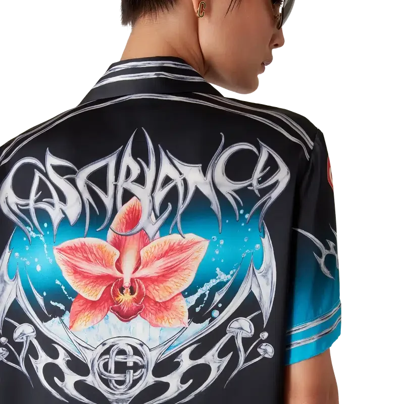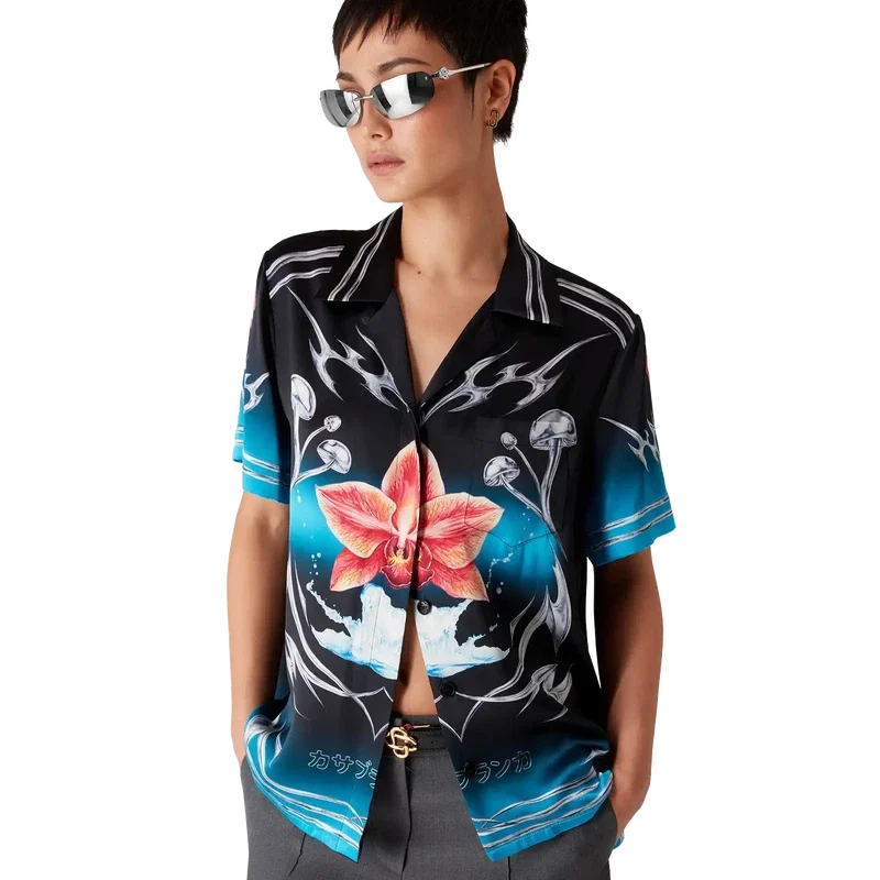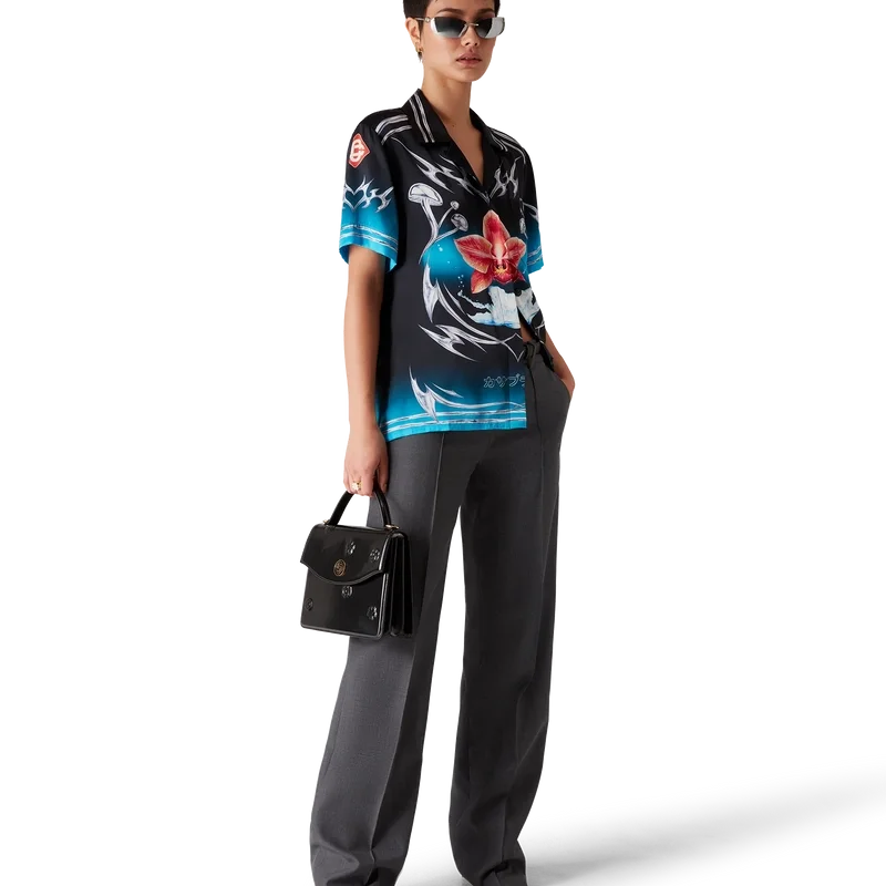 La chemise à manches courtes en satin de soie Blades présente un motif imprimé jouant sur le contraste entre deux sensations opposées : la netteté de la lame et le chrome argenté froid, contrastant avec la chaleur de la nature, comme les tons roses et rouges vifs d’une fleur d’orchidée. L’ajout de l’eau apporte une touche de fraîcheur et de vivacité au motif. Elle est dotée d’un col cubain, d’une poche poitrine, d’une fermeture à boutons et des boutons en corozo entrelacés emblématiques de la marque.