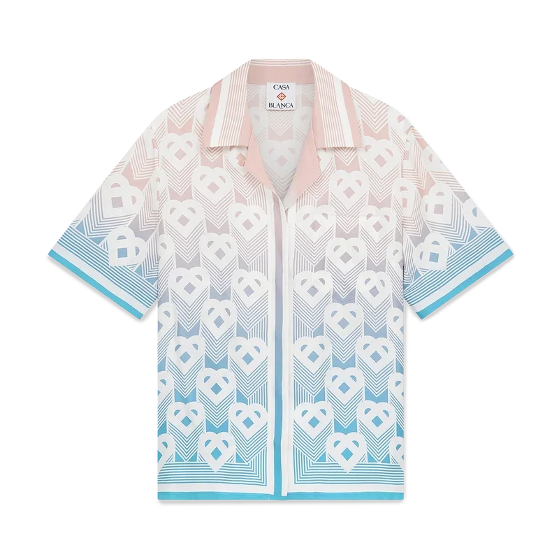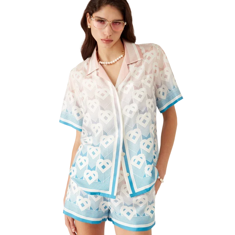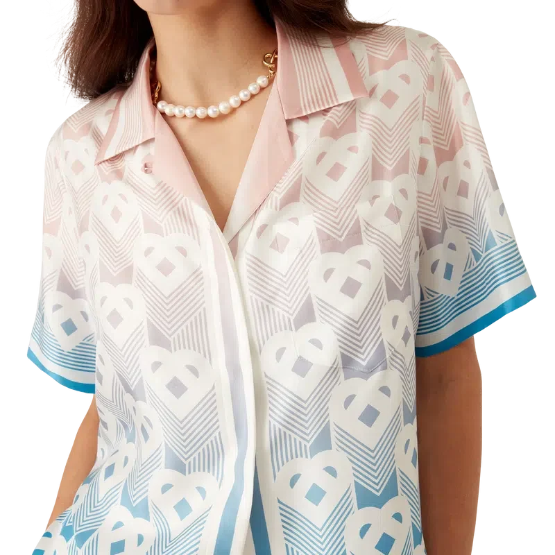 La chemise à shorts en soie à monogramme cœur dégradé présente un imprimé intégral représentant le monogramme cœur de la Maison sur un fond dégradé rose et bleu. Confectionnée dans un twill de soie à monogramme, elle est dotée d’un col cubain, d’une poche poitrine, ainsi que de détails rayés au niveau du col, des poignets, de l’ourlet et de la patte de boutonnage.