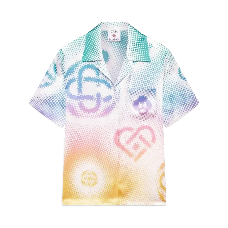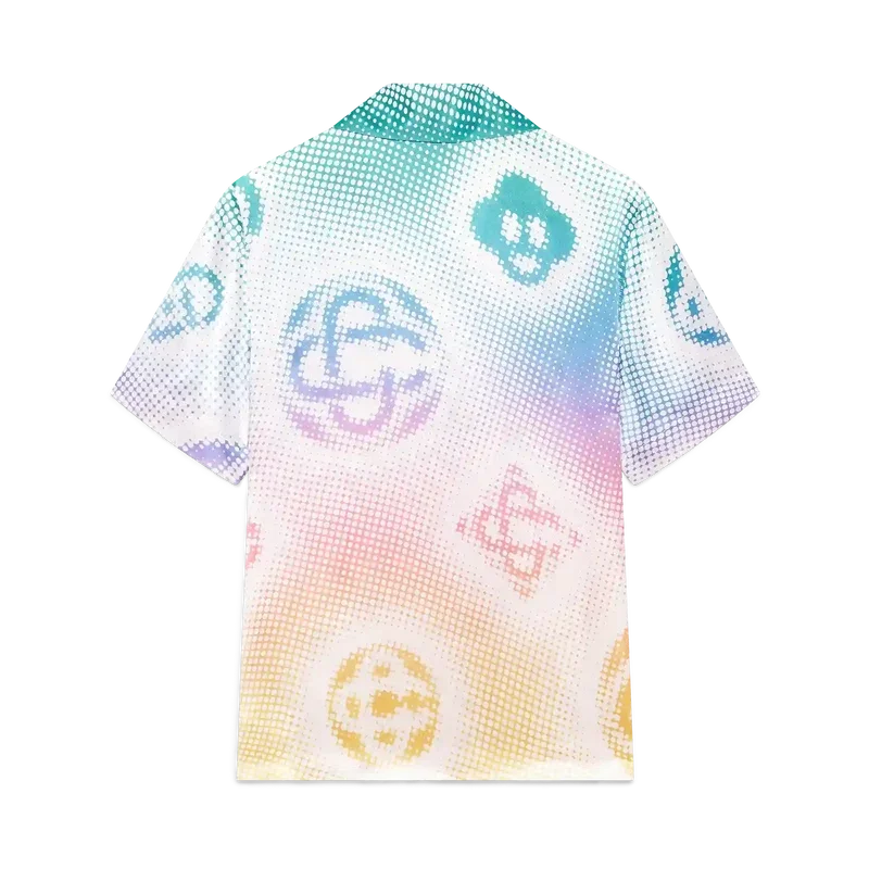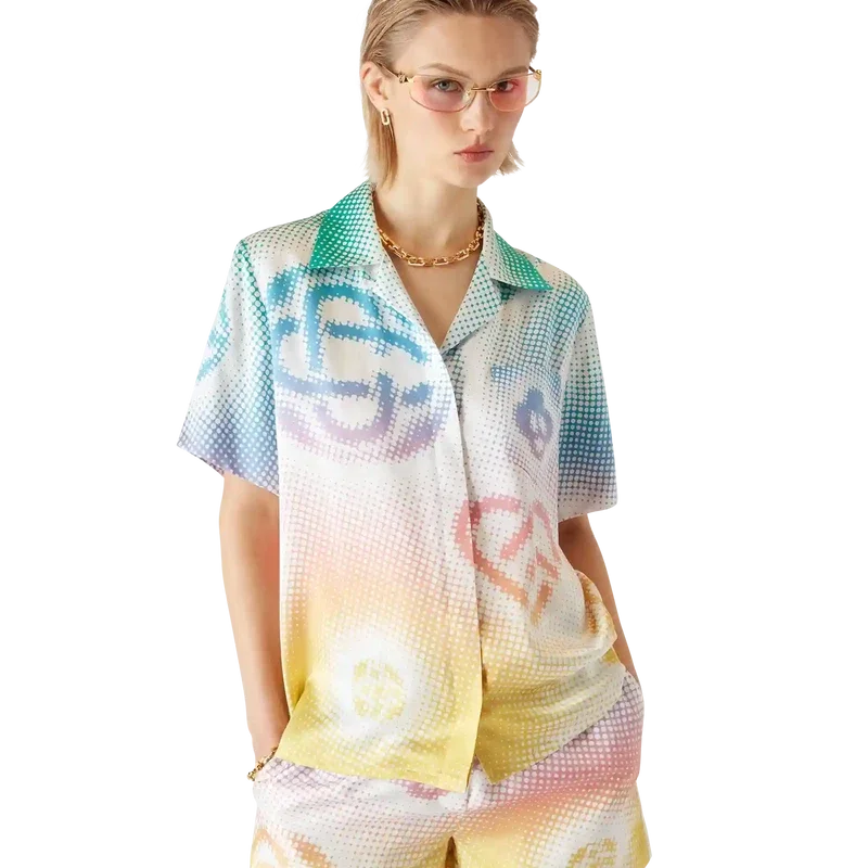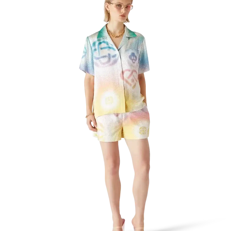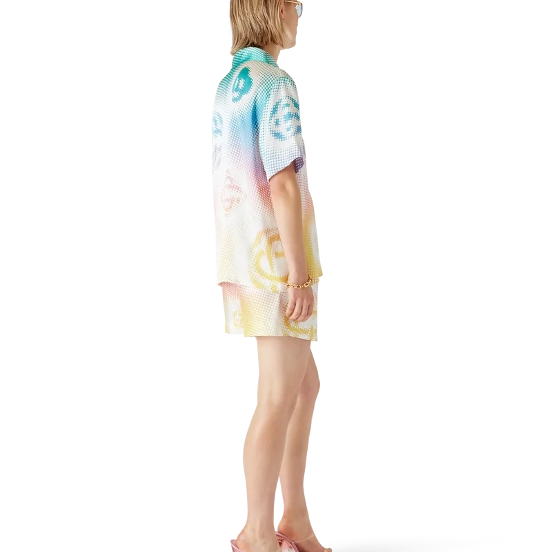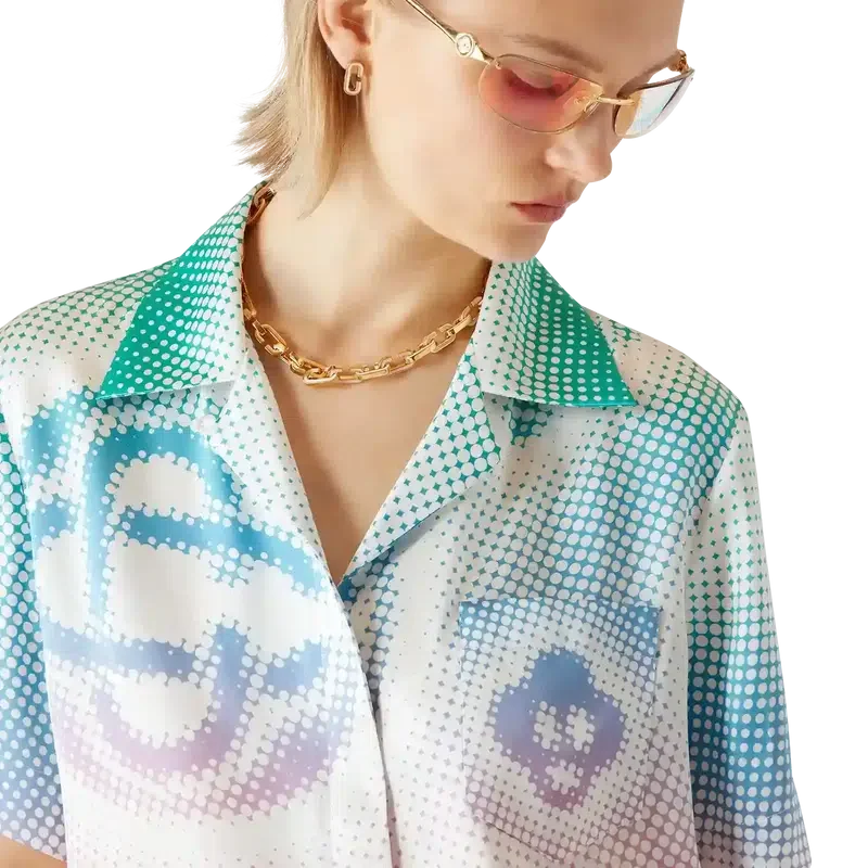 La chemise à manches courtes avec logo en demi-teinte présente un imprimé intégral représentant les monogrammes de la Maison réalisés à l’aérographe, s’inspirant de nos précédentes expérimentations avec cette technique. Elle est dotée d’un col cubain, d’une fermeture à boutons, d’une poche poitrine et de boutons en corozo arborant le logo CC entrelacé.