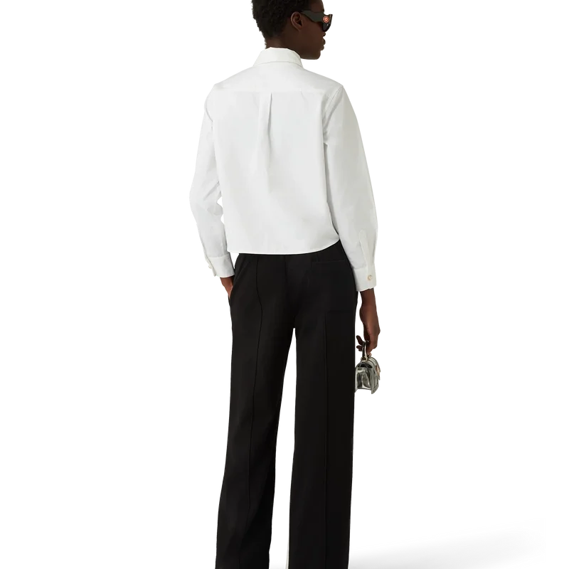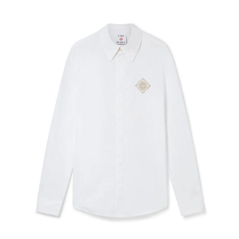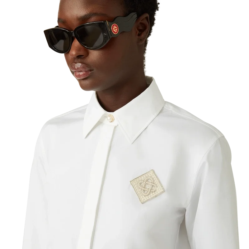 La chemise en coton avec patch diamant et perle est un modèle à manches longues confectionné en coton et orné du logo diamant emblématique de la maison, réinterprété pour cette saison. Elle est dotée d’un col en V classique, de boutons en perle cerclés d’or emblématiques au niveau du col et des poignets, ainsi que d’une fermeture à boutons cachée.