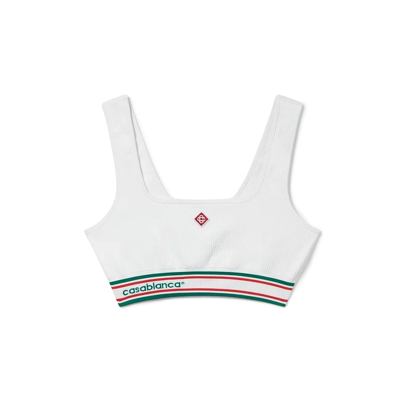 La bralette sans coutures présente un design épuré inspiré des vêtements de sport, avec le motif à rayures tennis emblématique, le logo Casablanca et un patch en forme de diamant. Confectionnée dans un tissu extensible sans coutures, elle offre une silhouette raffinée grâce à sa construction minimaliste. Elle est dotée d’une bande élastique sous la poitrine, de bretelles et d’un encolure dégagée.