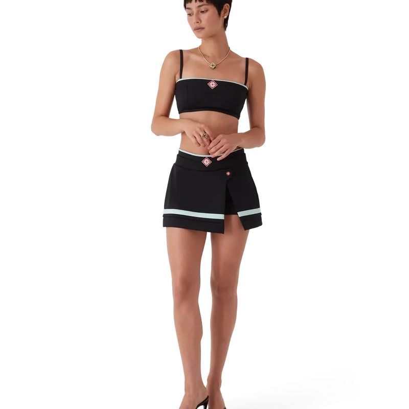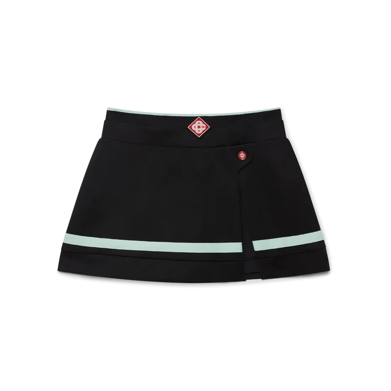 La mini-jupe en tricot est un modèle court d’inspiration sportive, orné du Diamond Monogram emblématique de la Maison au centre. Elle est dotée d’une ceinture en tricot côtelé, d’un bouton plat à l’effigie du logo CC, d’un short intégré, d’une fente, d’un ourlet à rayures horizontales noires, blanches, menthe et rouges, et d’une fermeture à glissière sur le côté.