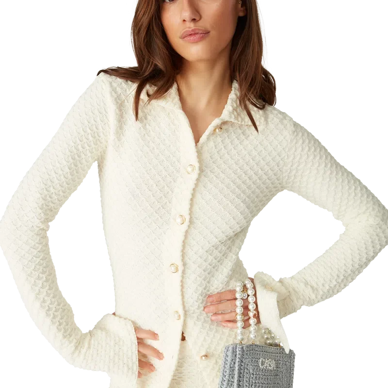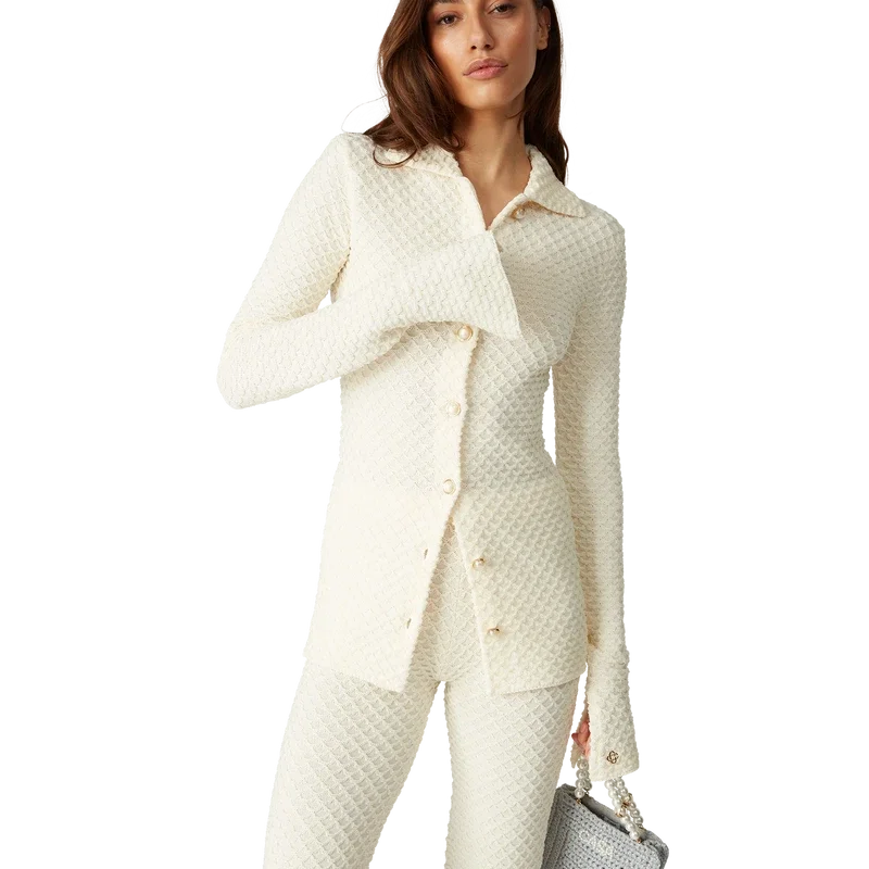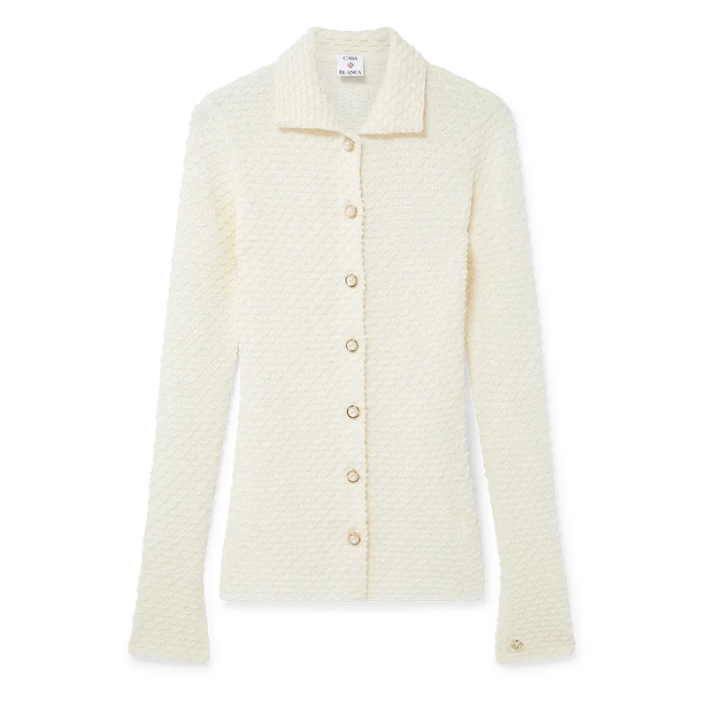 La chemise en tricot texturé est un modèle à manches longues confectionné dans un tissu en coton mélangé. Elle est dotée d’un col, de manches évasées fendues, d’une fermeture à boutons sur le devant, de boutons en perle bordés d’or emblématiques et d’un rivet Cc entrelacé plaqué or.