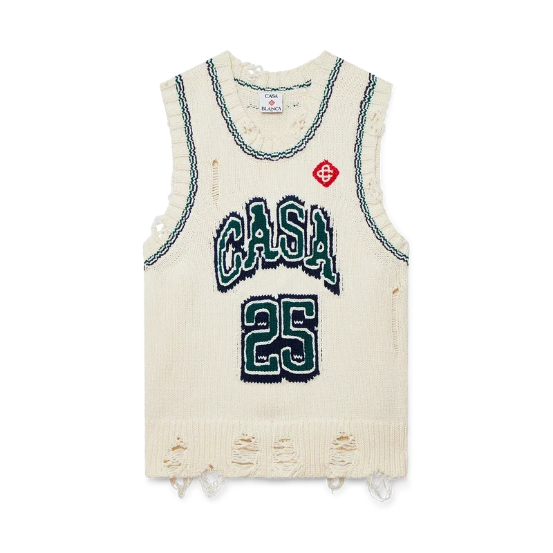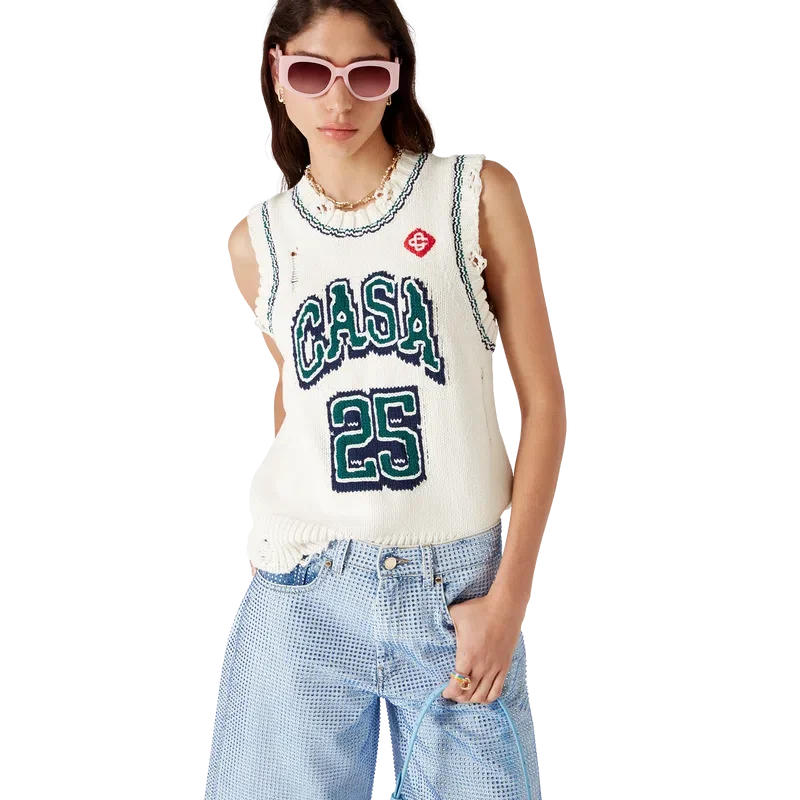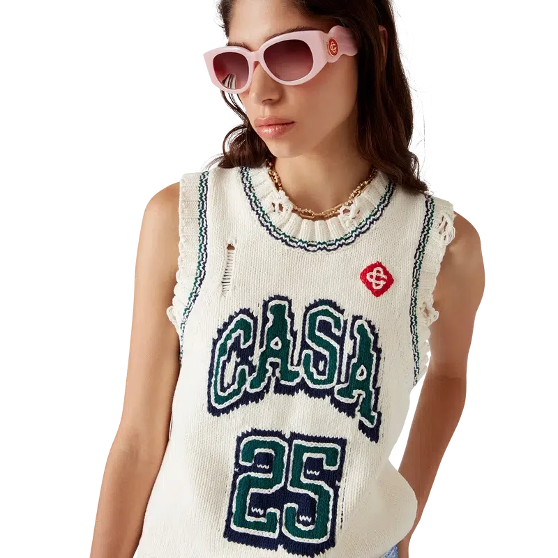 Le haut de baseball Intarsia est un modèle sans manches à l’aspect vieilli, confectionné en coton tricoté. Il est orné du texte « Casa », du logo en losange emblématique de la maison, ainsi que d’un col rond côtelé, d’empiècements aux emmanchures et d’un ourlet côtelé.