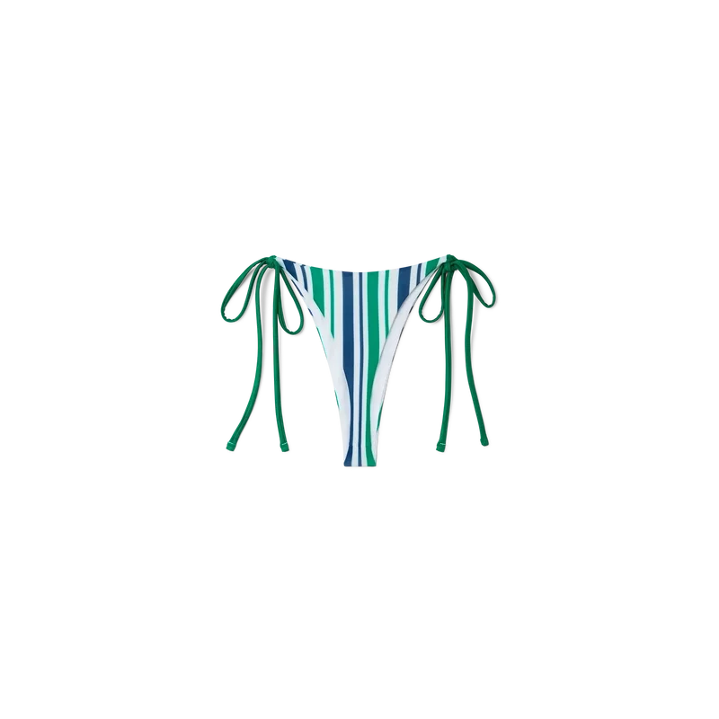 Bas de bikini à ficelles rayé aux couleurs de saison, avec ficelles blanches à nouer sur les hanches. Ce modèle est rehaussé de finitions vertes et est destiné à être porté avec son haut assorti.