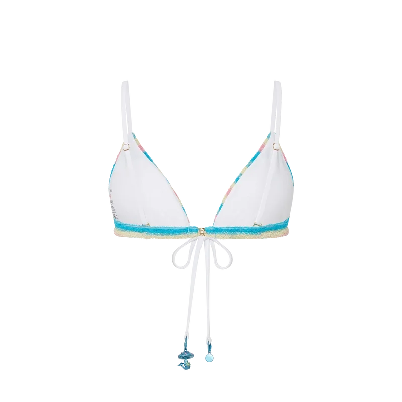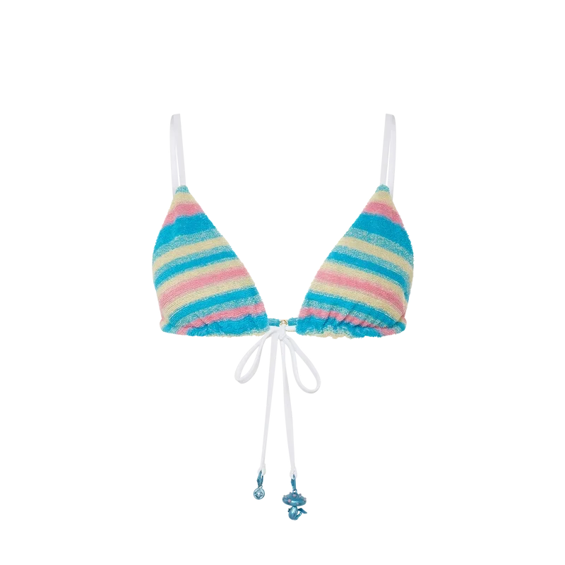 Le haut de bikini en tissu éponge rayé est confectionné dans un tissu éponge orné du rivet CC entrelacé plaqué or de la Maison. Il est doté d’une fermeture à cordon contrasté au niveau du cou et dans le dos, et rehaussé des breloques saisonnières en forme de champignon et du logo CC de la Maison.