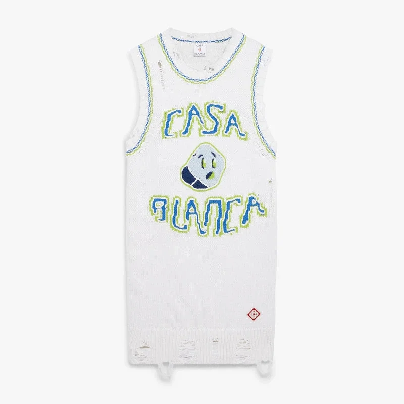 La mini-robe débardeur blanche tricotée à la main présente un design raffiné intégrant des éléments de la nouvelle saison, notamment des interprétations du logo Casablanca et du smiley sur le devant. Elle se distingue par des détails vieillis, un col rond, le logo en losange emblématique de la Maison et une silhouette débardeur sans manches.