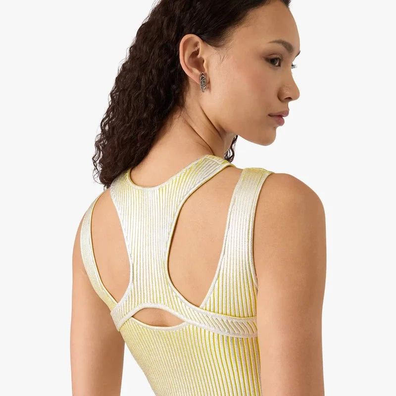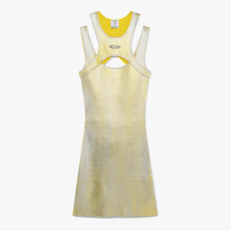 La mini-robe imprimée à la feuille d’or jaune est un modèle en maille raffiné sans manches, orné du logo de la Maison en filigrane argenté. Elle présente un dos nageur et une silhouette mini flatteuse incarnant les codes stylistiques de la Maison.