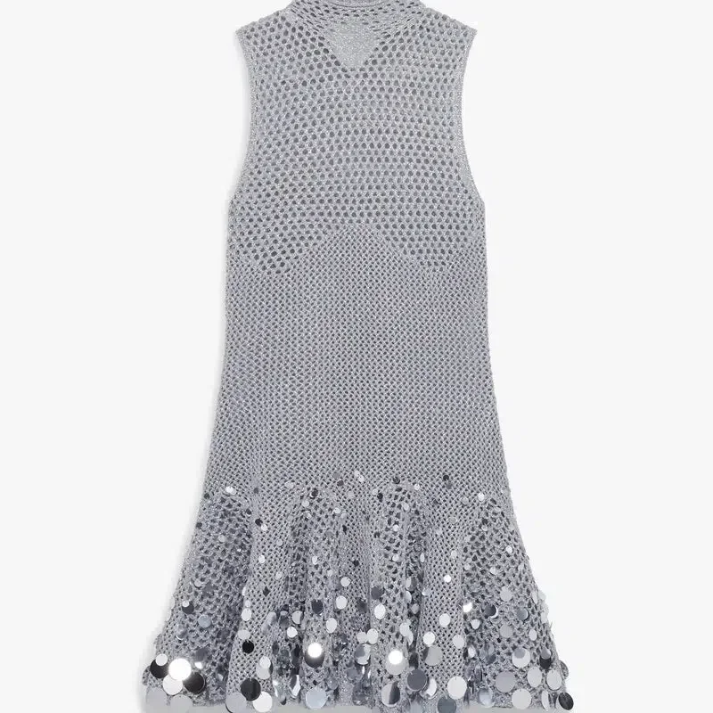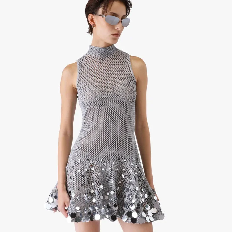 La mini-robe en crochet argenté est un modèle raffiné de coupe trapèze, réalisé dans un délicat crochet miroir argenté. Elle présente un col montant, un corsage ajusté et une silhouette sans manches.