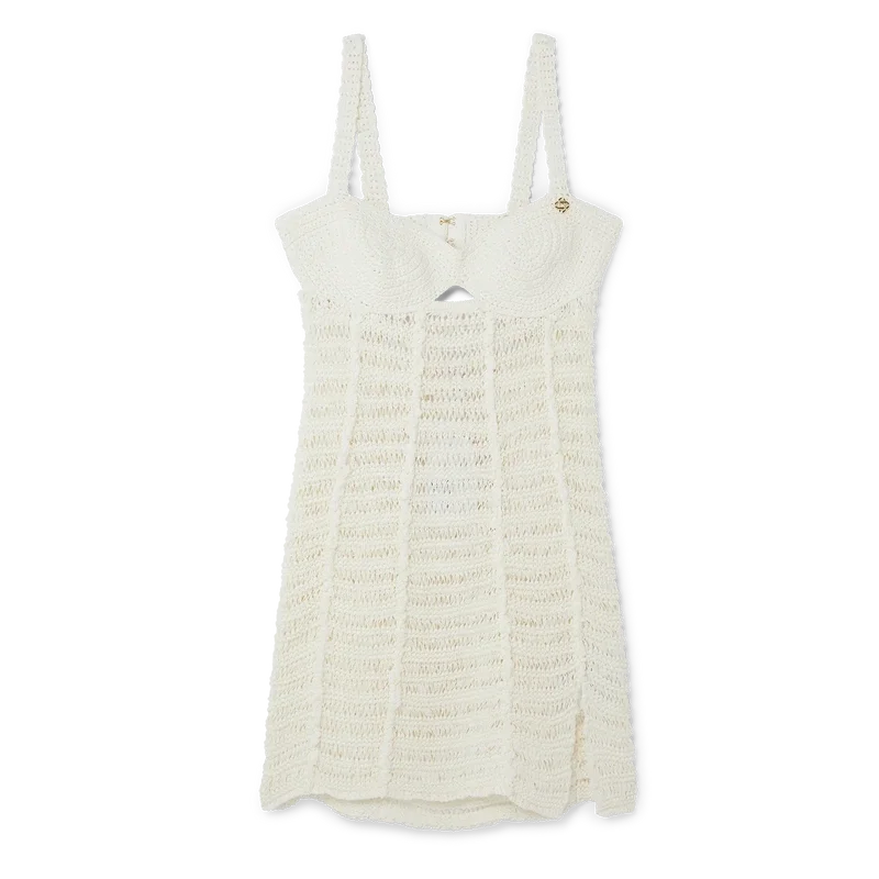 La robe bustier en crochet est une mini-robe confectionnée dans un tissu en coton mélangé à mailles ouvertes, avec une bralette ajustée et un dos profondément échancré. Elle est dotée d’une fermeture à agrafes, d’un rivet CC entrelacé plaqué or et de bretelles.