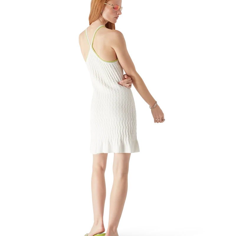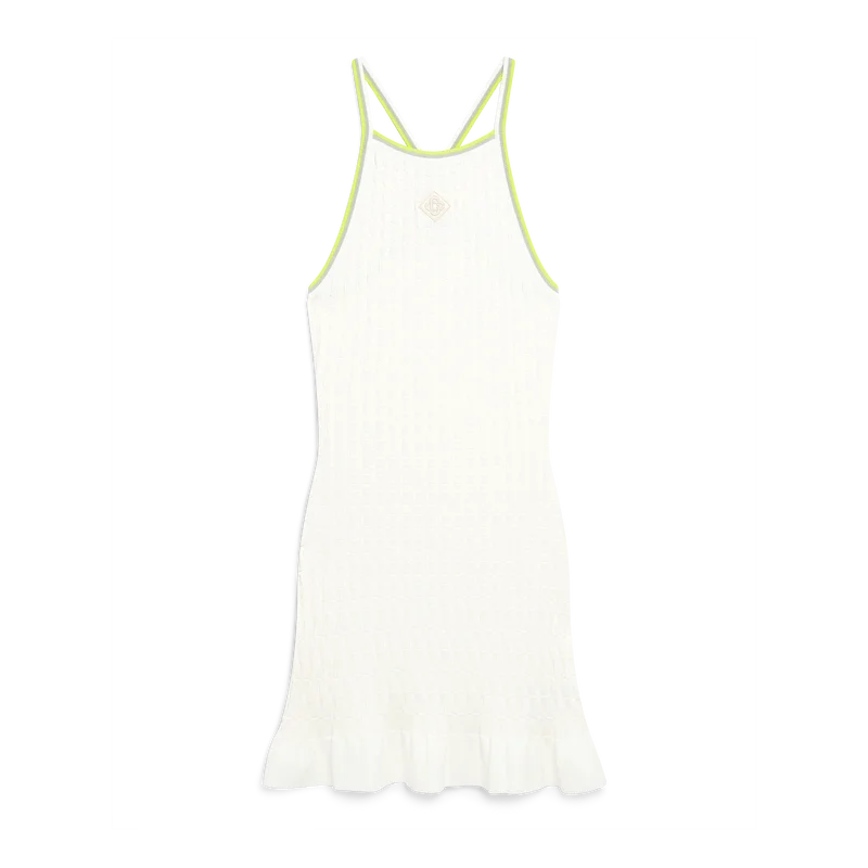 La mini-robe de tennis à bretelles présente un motif imprimé avec le logo en forme de diamant de la maison au centre. Elle est agrémentée de détails de bordure verte, d’un ourlet à volants et d’une silhouette classique inspirée du tennis.