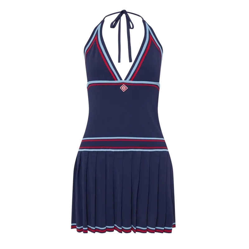 La robe dos nu plissée est une robe courte avec un corsage ajusté, confectionnée dans un tissu tricoté orné du logo en losange emblématique de la maison. Elle est agrémentée de rayures rouges et blanches contrastées sur le corsage et l’ourlet, d’un décolleté en V profond, d’une fermeture à cordons et d’un empiècement plissé.