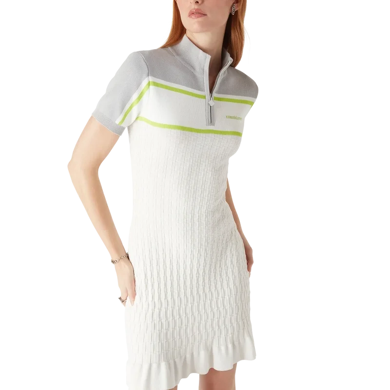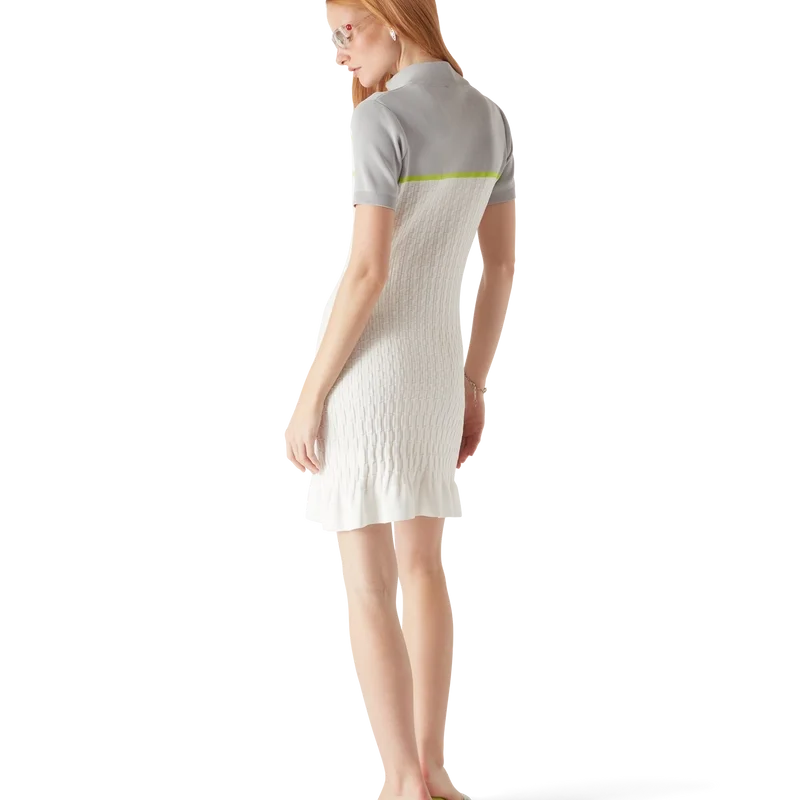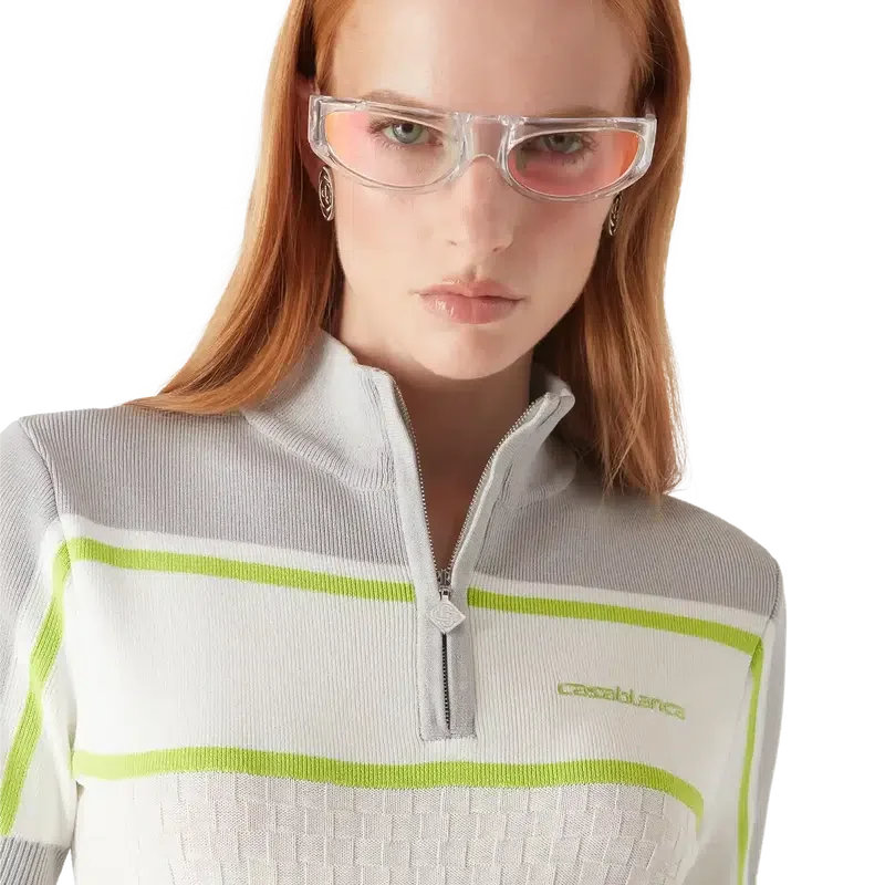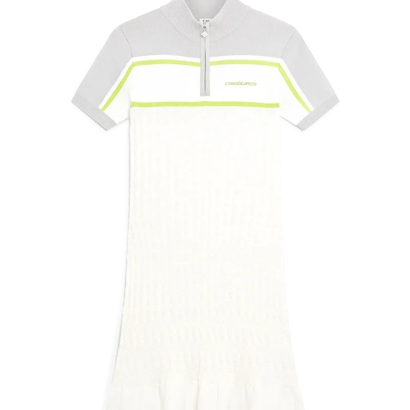 La robe polo de tennis est un modèle en maille à manches courtes, avec des épaules et des manches extérieures contrastées. Elle est dotée d’une fermeture à glissière avec une tirette arborant le logo diamant emblématique de la maison, d’un col montant, de détails rayés, du logo Casablanca emblématique, de poignets côtelés et d’un ourlet à volants.