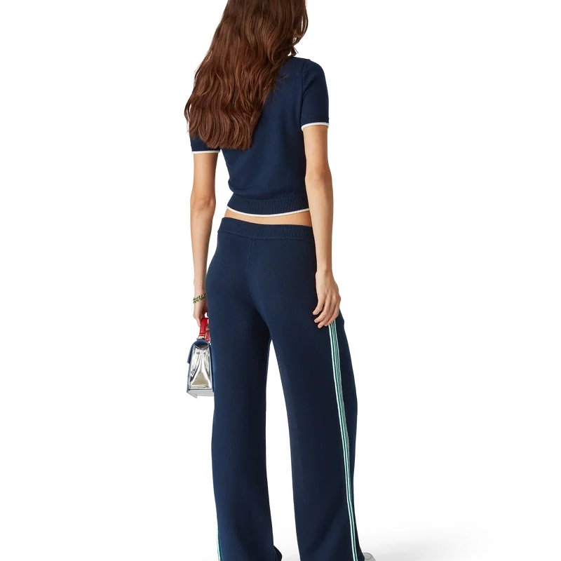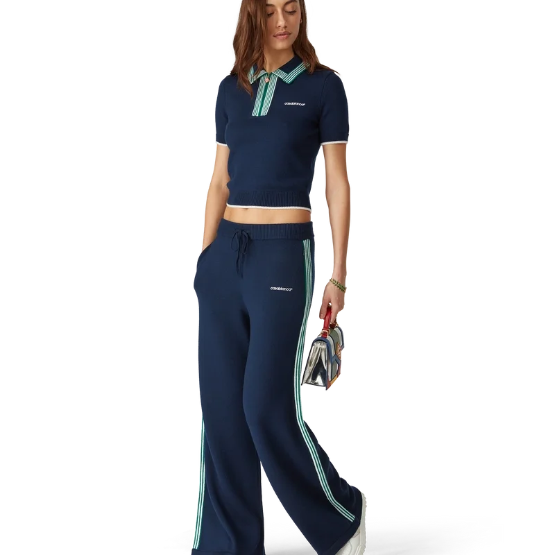 Le pantalon de tennis en maille présente une coupe droite et est confectionné dans un tissu en laine mérinos. Il est doté d’une ceinture élastiquée, de poches latérales dans les coutures, de rayures sur les côtés et du logo Casablanca emblématique.