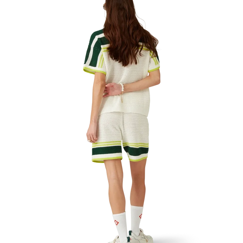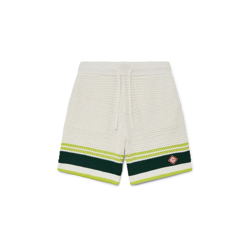 Le short de tennis en crochet présente une texture douce et est confectionné en coton tricoté, orné du logo en losange emblématique de la maison. Il est doté d’une ceinture élastiquée côtelée avec cordon de serrage, de poches latérales et de détails à rayures contrastées sur les jambes.
