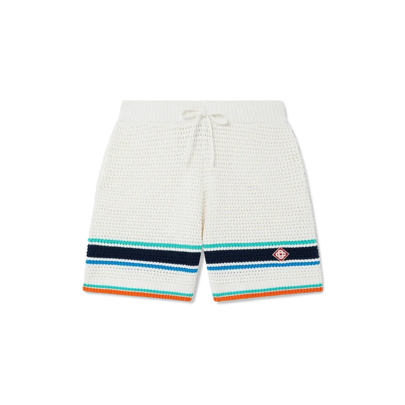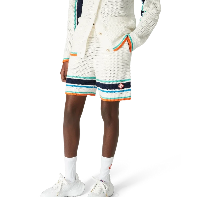 Le short de tennis au motif crochet présente une texture douce et est confectionné en coton biologique tricoté. Il arbore le logo en losange emblématique de la maison, en écho au thème du voyage et des vacances de la collection capsule. Il est doté d’une ceinture élastiquée côtelée avec cordon de serrage, de poches latérales, de détails rayés aqua, bleus et blancs, ainsi que d’une bordure orange contrastante.