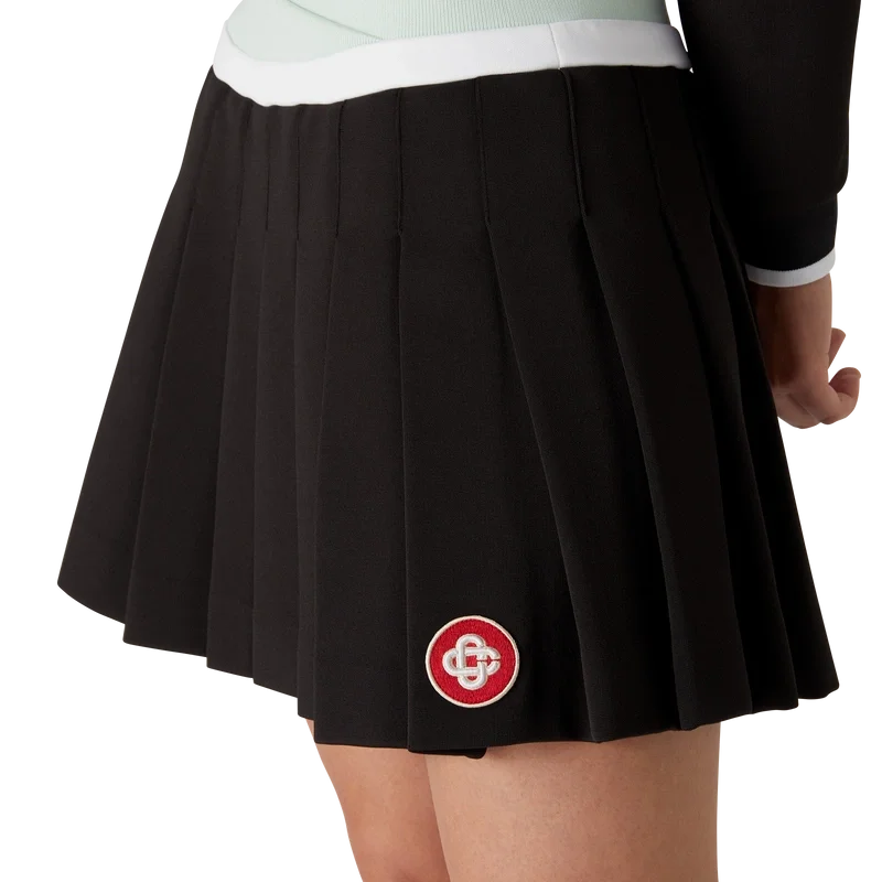 La mini-jupe plissée en scuba est un modèle court à la silhouette évasée, orné du logo en losange emblématique de la maison, confectionné dans un tissu en viscose. Elle est agrémentée d’une ceinture tricotée superposée verte et blanche et d’un empiècement plissé.