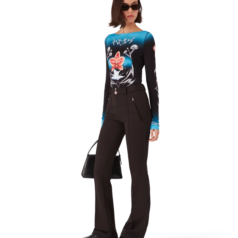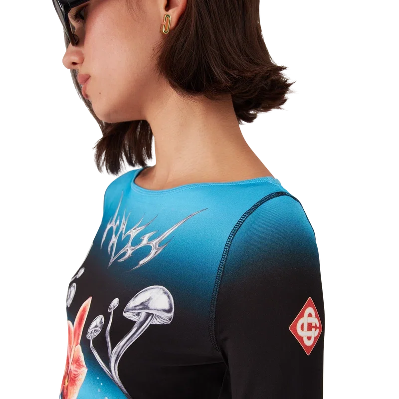 Le haut à manches longues Blades présente un motif imprimé reprenant le thème artistique de la saison, qui joue sur le contraste entre deux sensations opposées : la netteté de la lame et le chrome argenté froid, contrastant avec la chaleur de la nature, comme les tons roses et rouges vifs d’une fleur d’orchidée. L’ajout de gouttelettes d’eau apporte une touche de fraîcheur et de vivacité au motif. Le tout est complété par un col bateau, des poignets rayés et le logo en forme de diamant emblématique de la marque sur les manches.