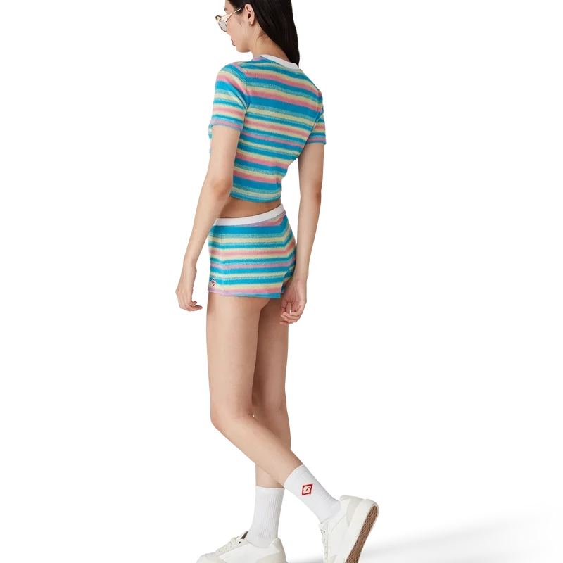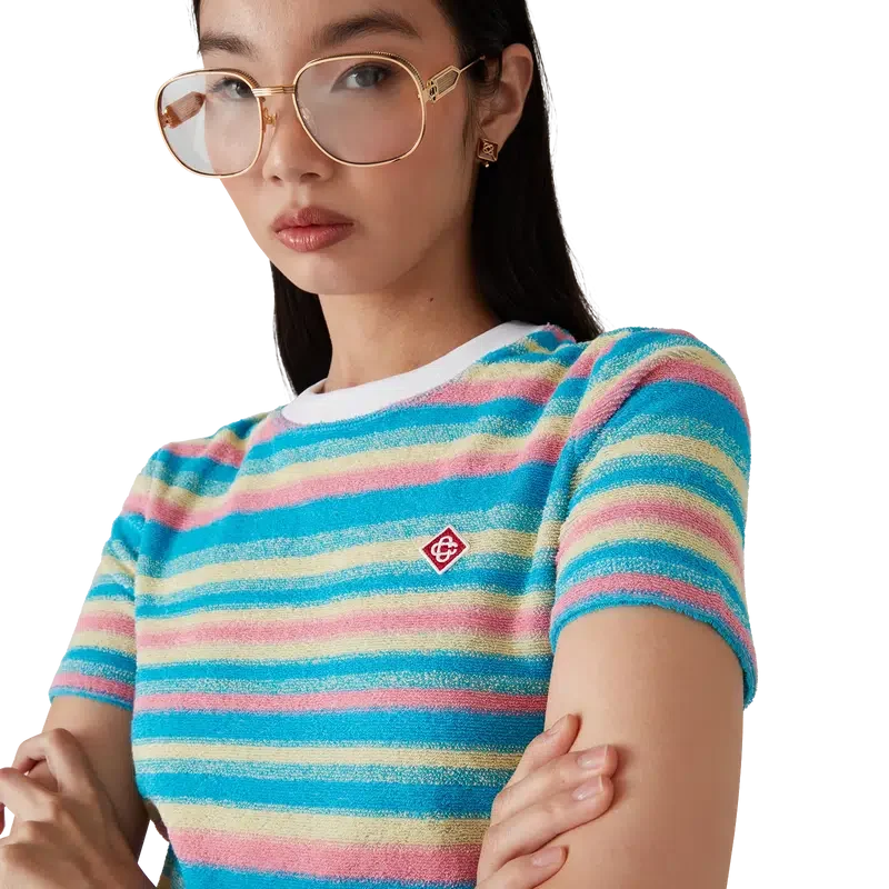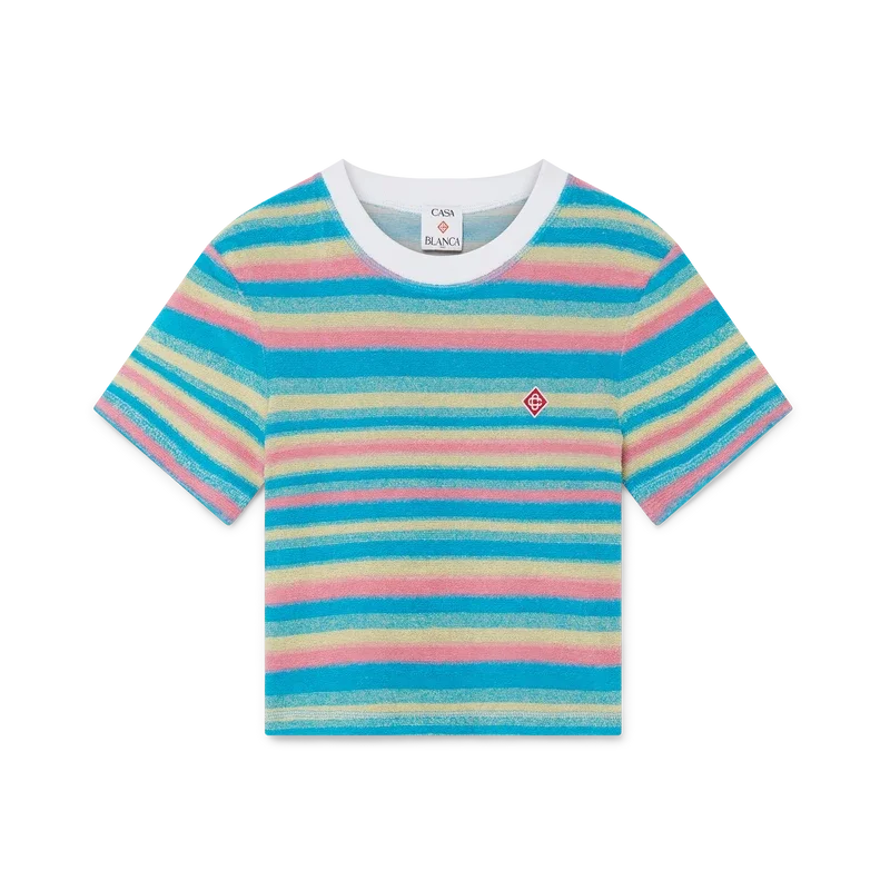 Le haut en tissu éponge à rayures est un modèle à manches courtes confectionné en tissu éponge et orné du logo en losange emblématique de la maison. Il est doté d’un col rond classique.