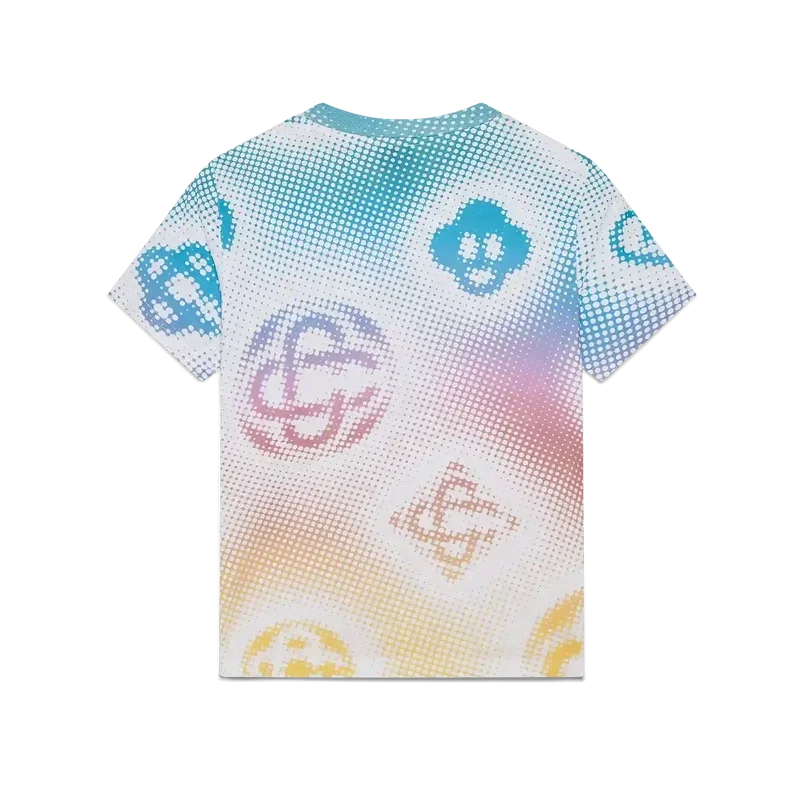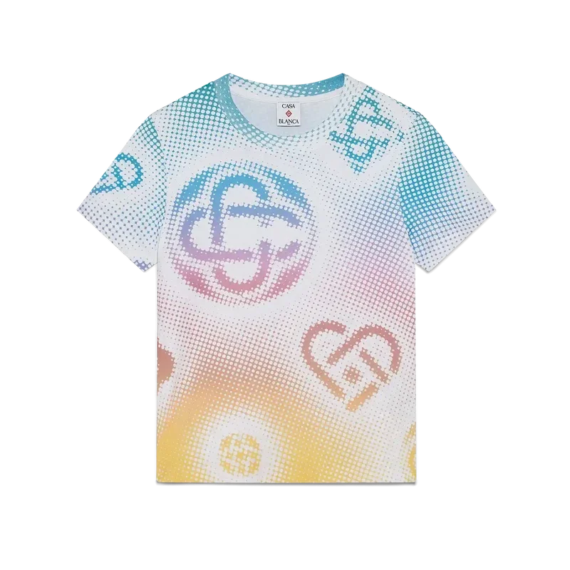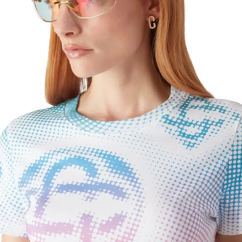 Le t-shirt ajusté avec logo en demi-teinte présente un imprimé multicolore sur toute la surface, mettant en avant le logo de la maison dans un graphisme raffiné. Il est doté d’un col rond côtelé classique.