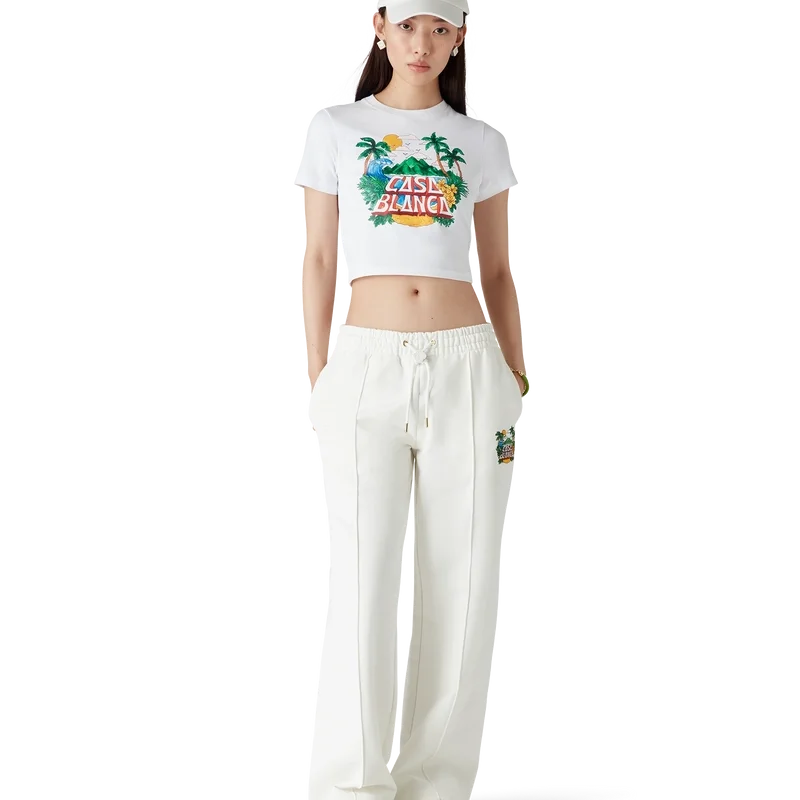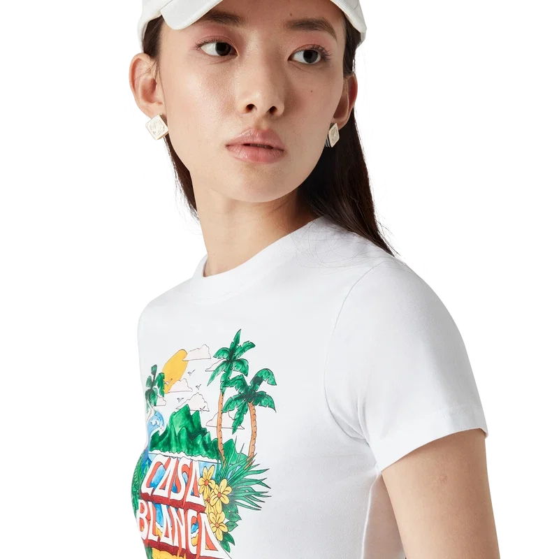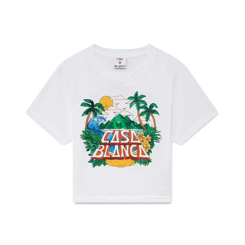 Le t-shirt court Casa Beach Wave est un modèle à manches courtes et imprimé, confectionné en coton, arborant un motif emblématique inspiré des t-shirts souvenirs que l’on achète en vacances à la plage. Doté d’un col rond classique, il est conçu pour s’arrêter au-dessus du nombril.