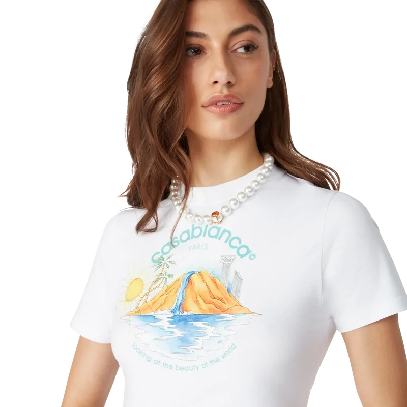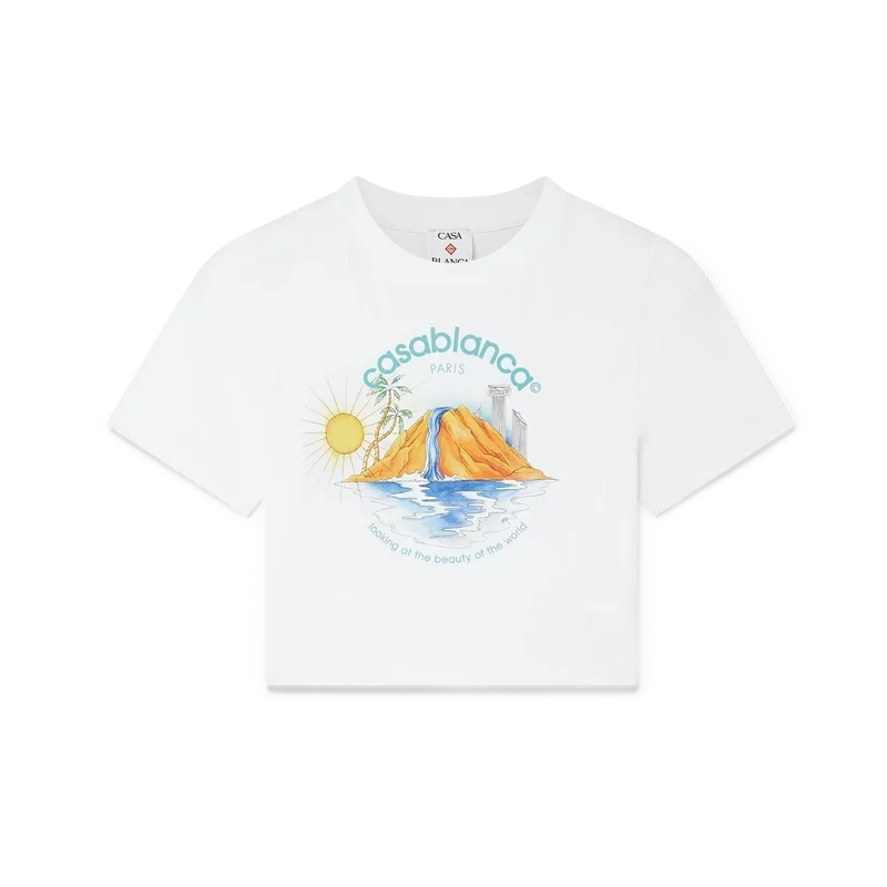 Le t-shirt court Oasis est un modèle à manches courtes imprimé, confectionné en coton biologique, arborant le motif saisonnier de la maison avec des éléments de design inspirés de la nature, de l’architecture et du tennis. Il est doté d’un col rond classique. Conçu pour tomber au-dessus du nombril.