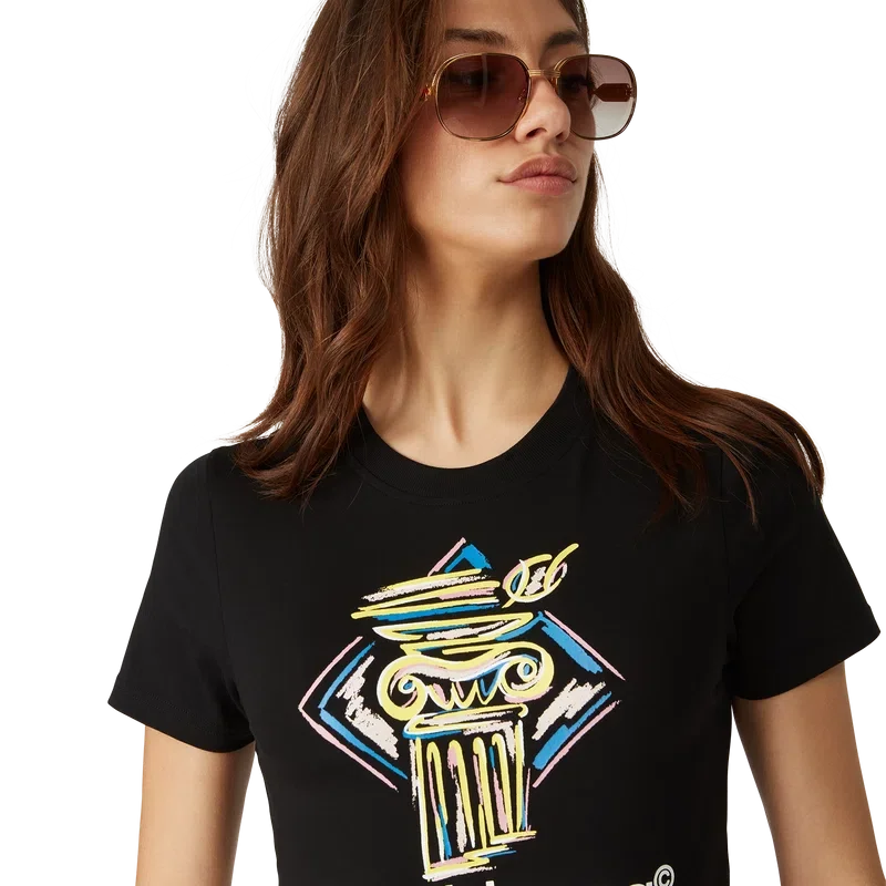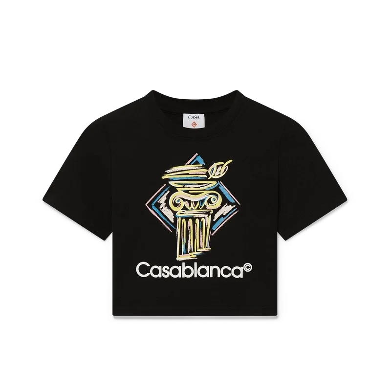 Le t-shirt Diamond Column Baby est un modèle court à manches courtes imprimé, confectionné dans un tissu en coton mélangé et orné de l’iconographie Crayon de la maison représentant une colonne. Il est doté d’un col rond classique et conçu pour s’arrêter au-dessus du nombril.