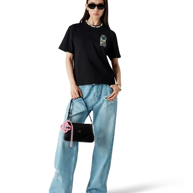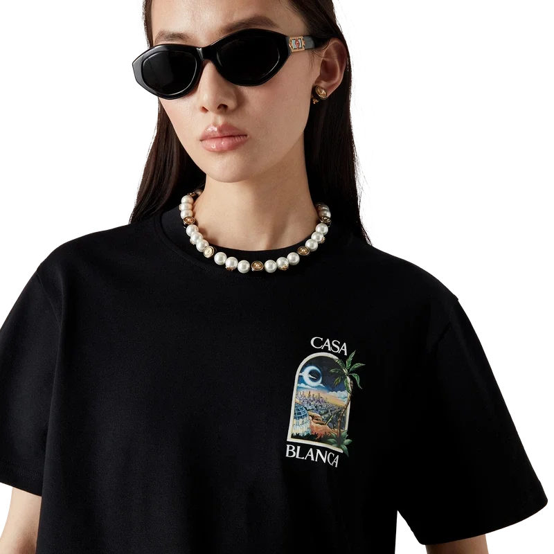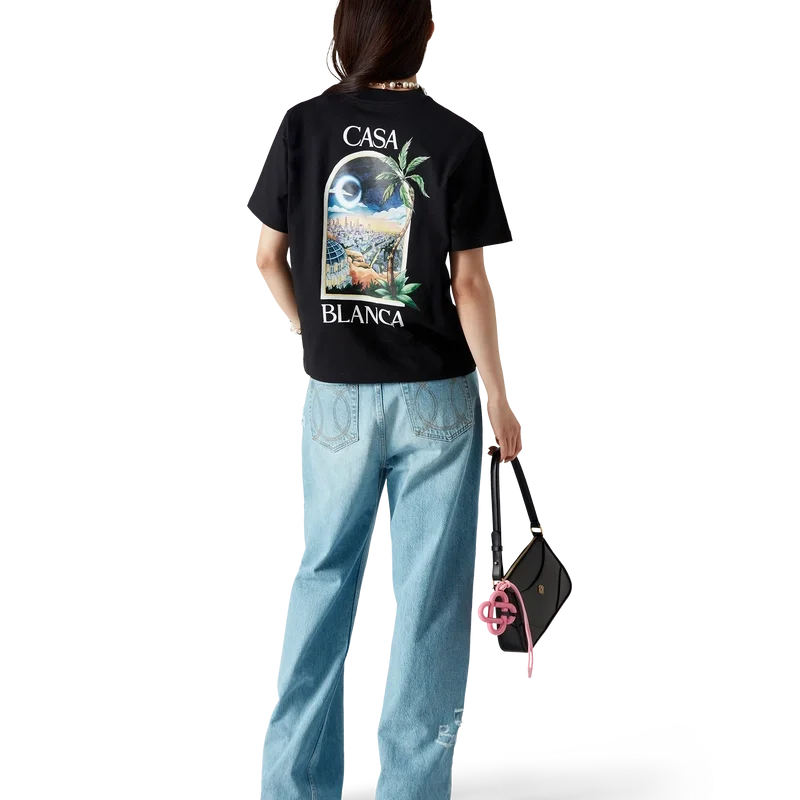 Le t-shirt La Nights est un modèle à manches courtes imprimé, confectionné en coton biologique et orné d’un motif emblématique représentant une fenêtre donnant sur un paysage nocturne de Los Angeles. Il est doté d’un col rond classique.