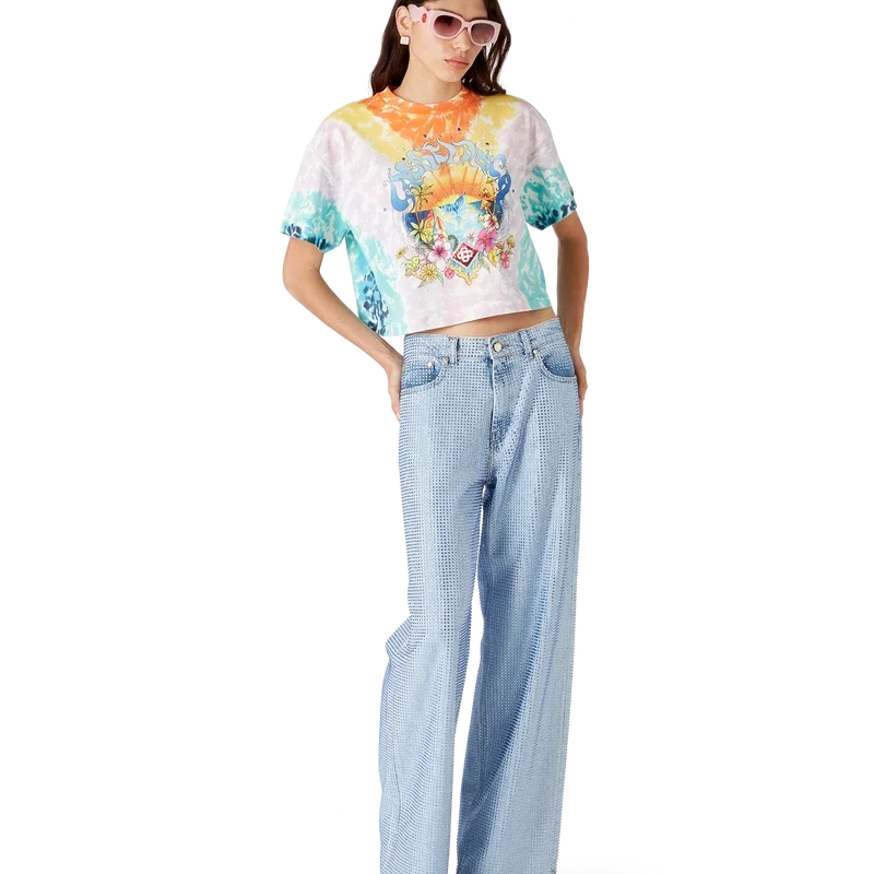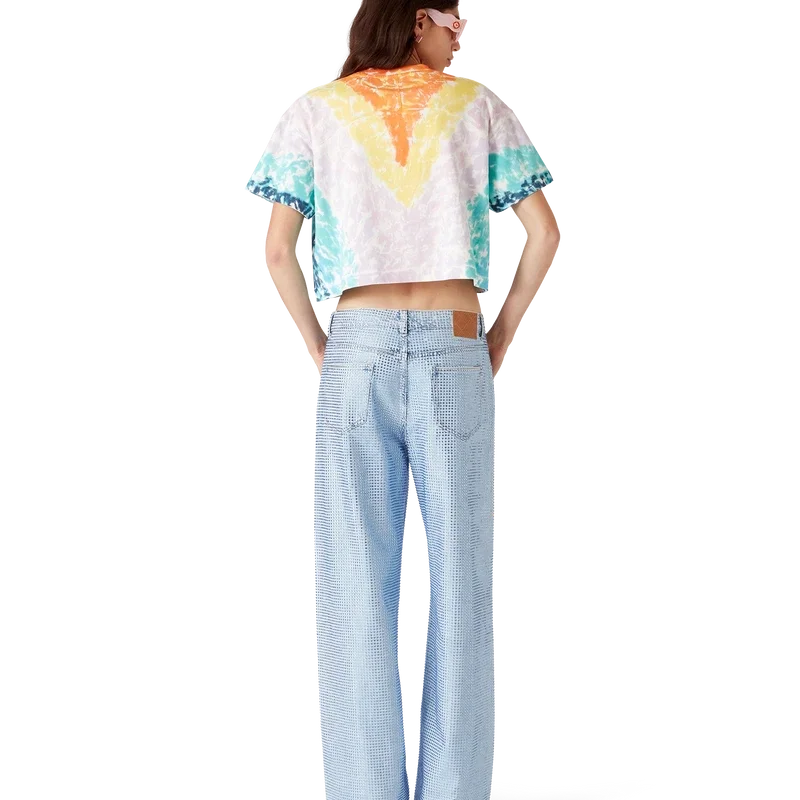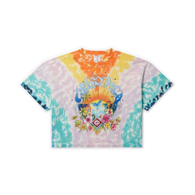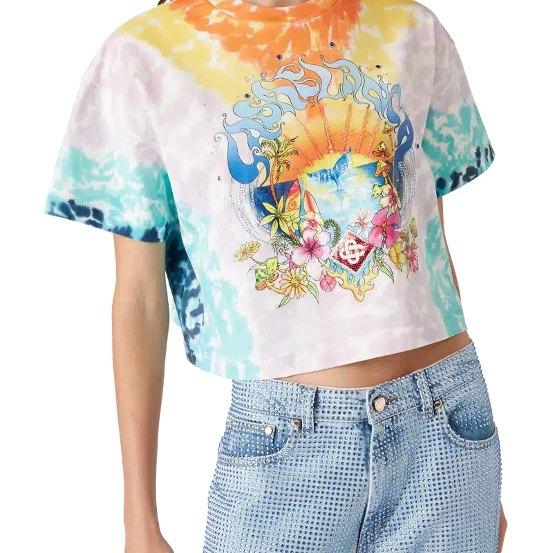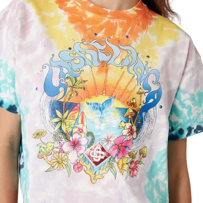 Le t-shirt Surf Trip Tie Dye est un modèle à manches courtes imprimé, confectionné en coton biologique. Il présente un motif saisonnier inspiré de la culture surf vintage de Malibu, utilisant la typographie de cette époque, sur un fond tie-dye faisant référence à la culture hippie. Il est doté d’un col rond côtelé classique. Conçu pour tomber au-dessus du nombril.
