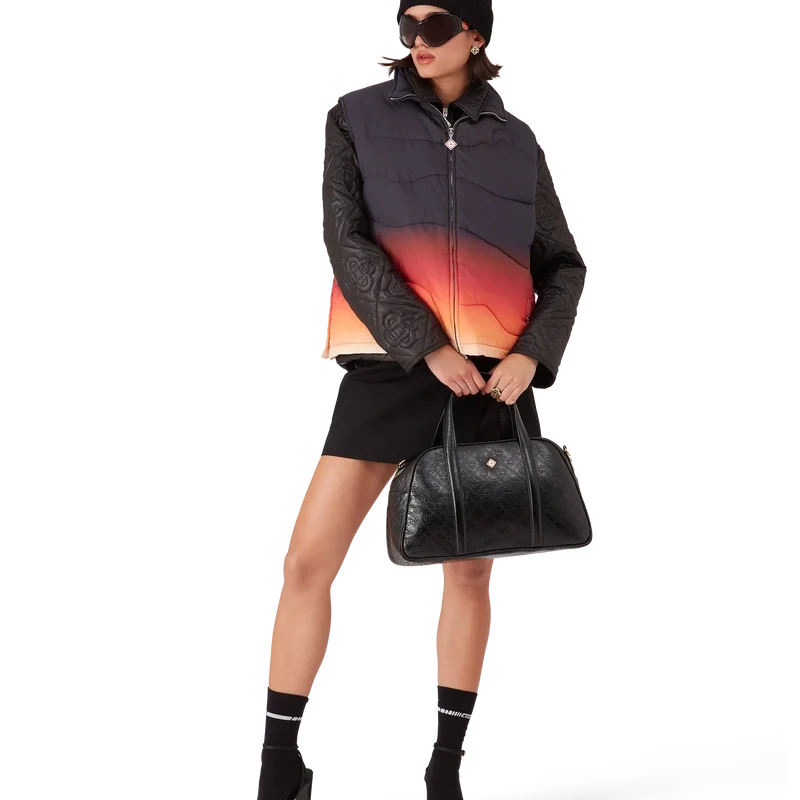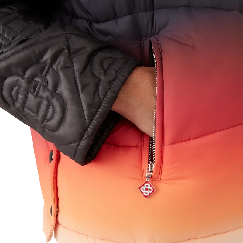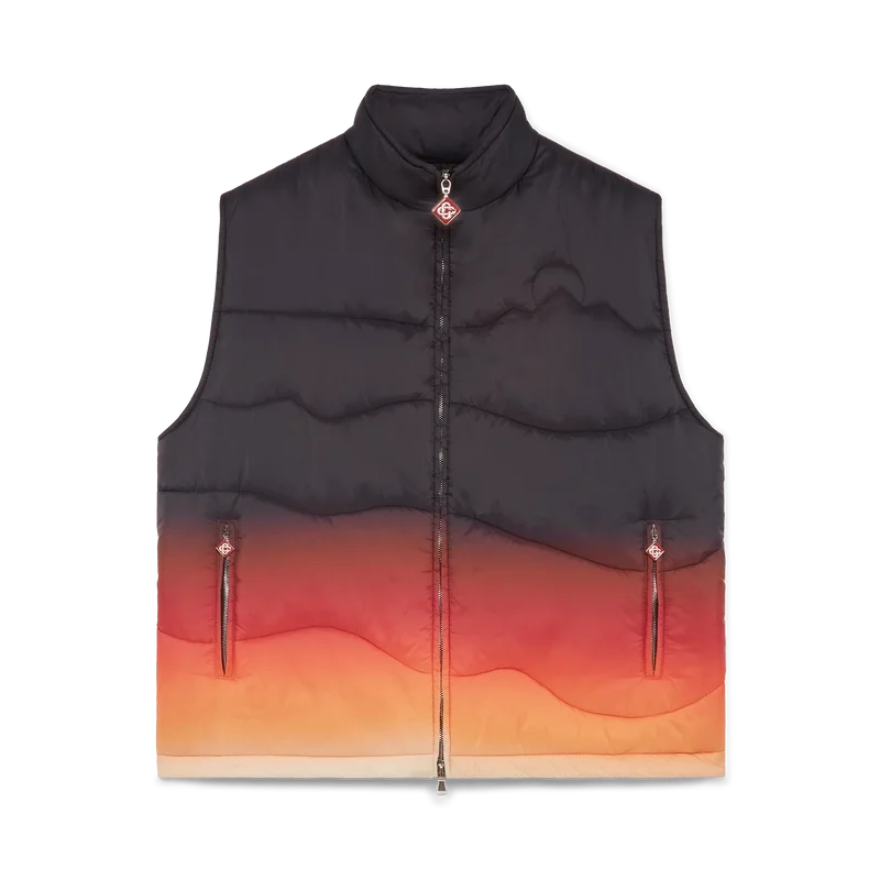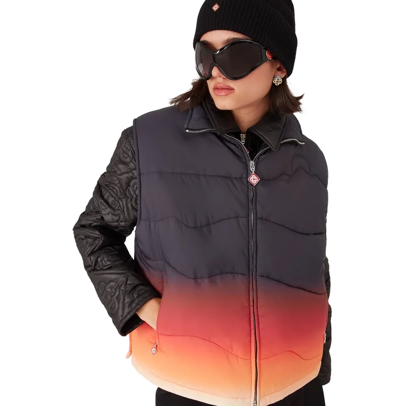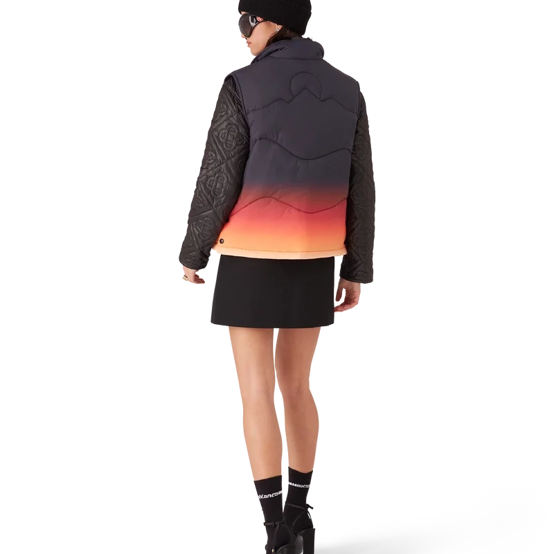 Le gilet matelassé en nylon dégradé est un vêtement d’extérieur raffiné, confectionné dans un tissu en nylon imprimé dégradé, inspiré par les transitions de couleurs à couper le souffle de l’aube et du crépuscule sur la campagne enneigée du Japon. Il évoque des moments spectaculaires où un ciel vibrant illumine les paysages montagneux ruraux et où les villages brillent sur fond de montagnes alpines.