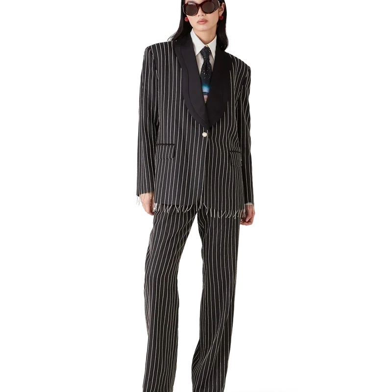 La veste ajustée ornée de cristaux est un modèle à simple boutonnage confectionné dans un tissu de tailleur en soie et agrémenté de cristaux. Elle est dotée d’une fermeture à boutons, de boutons en perle à bordure dorée emblématiques, de poches avant à rabat, d’une fente arrière, de revers et d’une doublure.