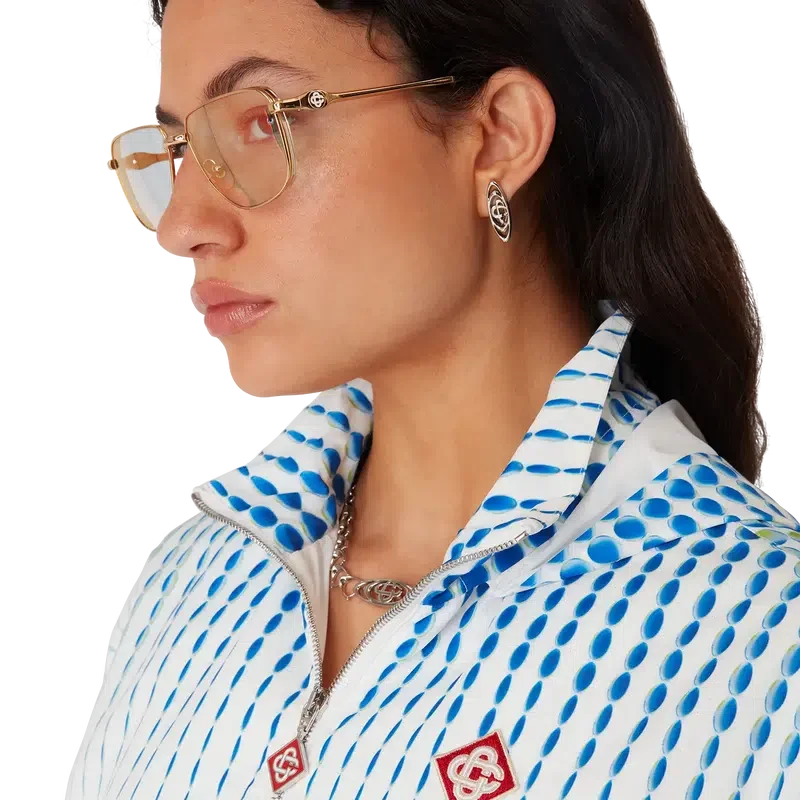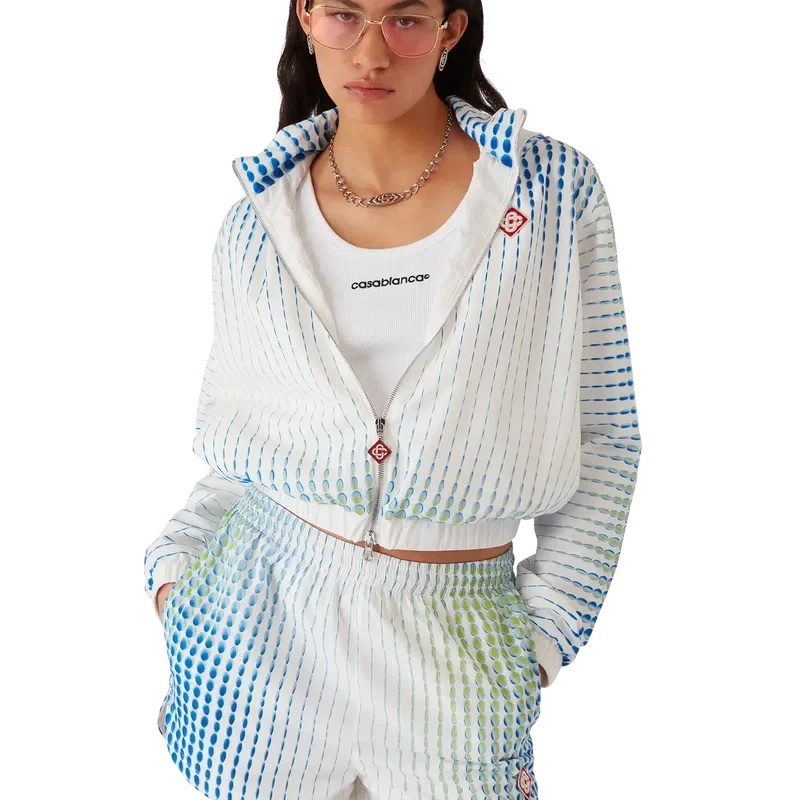 La veste coupe-vent Dots est un modèle de sport confectionné dans un taffetas technique, orné des motifs dégradés et des effets de texture caractéristiques de la Maison. Elle présente des manches longues, une capuche avec cordon de serrage, des poignets et un ourlet élastiqués, une fermeture à glissière dotée de la languette en forme de diamant emblématique de la Maison, ainsi que le logo diamant de la Maison.