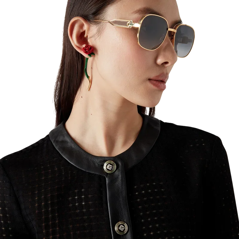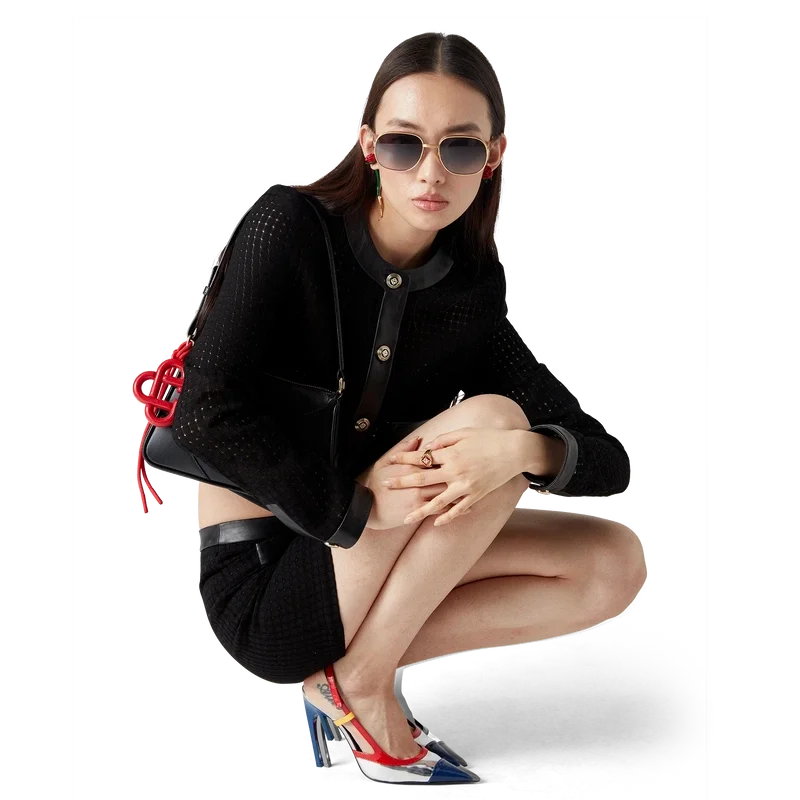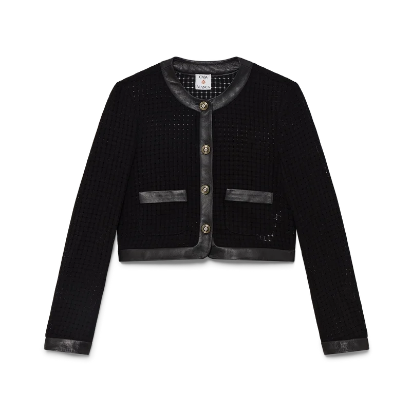 La veste courte ajustée à mailles ouvertes est un modèle court à manches longues et sans col, confectionné en tissu Cordonetto. Elle est dotée d’une fermeture à boutons, de boutons en perle à bordure dorée emblématiques, de poches plaquées sur le devant et de finitions en cuir.