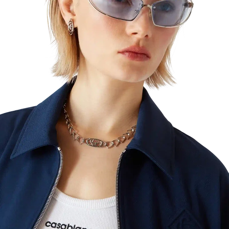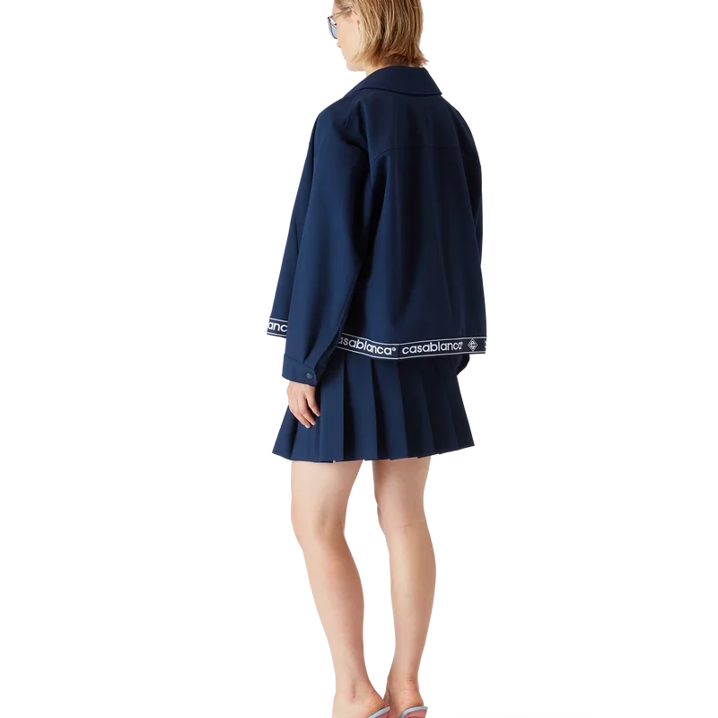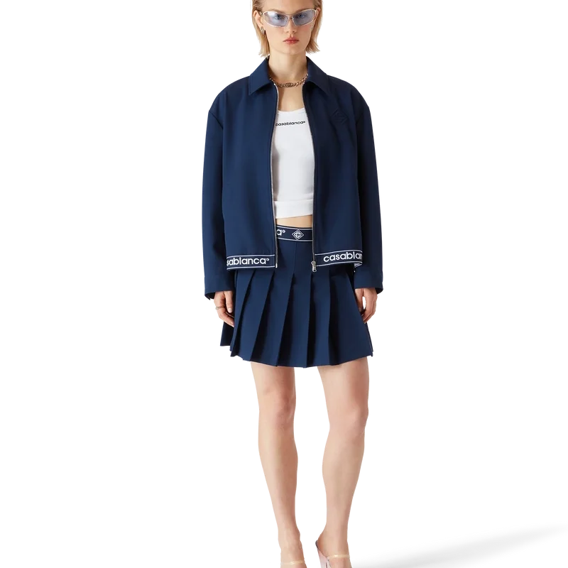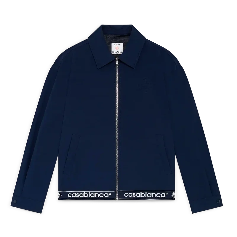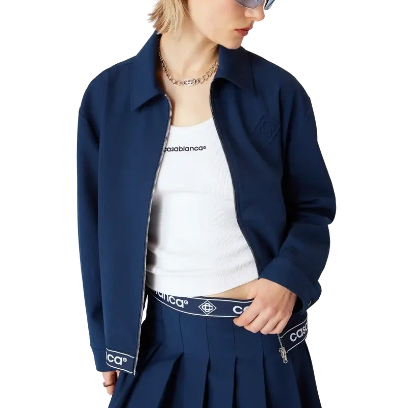 La veste de costume en laine bleu marine est un modèle de coupe sportive confectionné dans un tissu en laine mélangée, reflétant l’approche raffinée de la Maison en matière de costumes. Elle est dotée d’une fermeture à glissière avec une tirette Diamond Monogram, d’un col en pointe, de poches latérales passepoilées, d’un ourlet à bandeau orné du logo Casablanca et d’une bordure rayée.