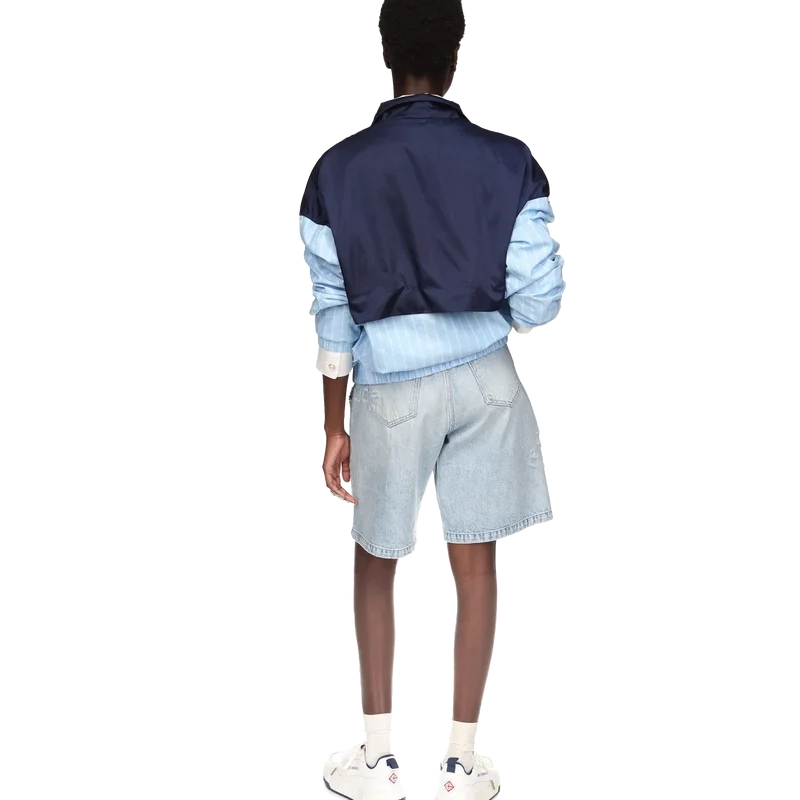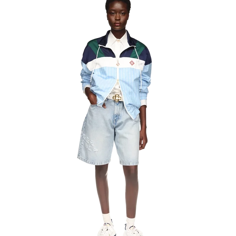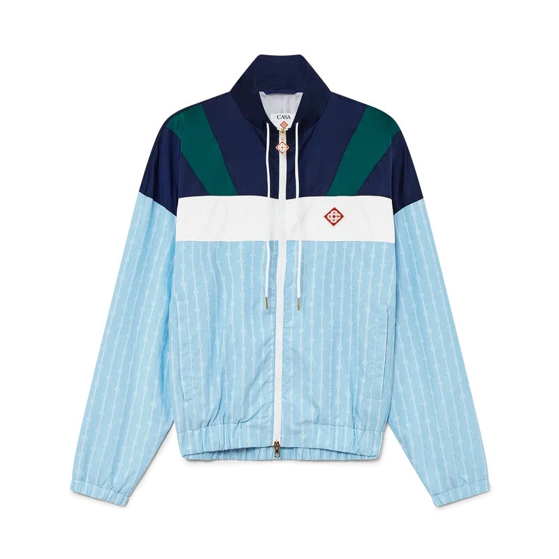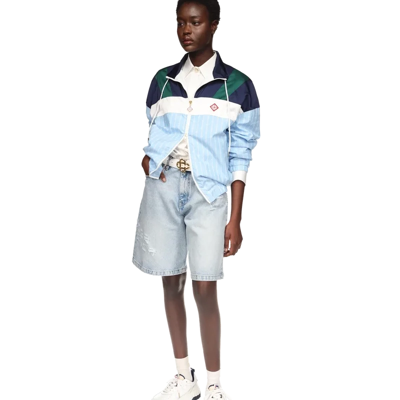 La veste de survêtement en nylon à fines rayures est un modèle de sport confectionné dans un tissu technique et orné du logo en losange emblématique de la maison. Elle est dotée d’une fermeture à glissière, de empiècements bleu marine, verts et blancs sur les épaules et la poitrine, d’un col polo avec cordon de serrage, de poches passepoilées verticales, d’une protection anti-pluie et d’un empiècement d’aération, ainsi que d’un ourlet et de poignets élastiqués.