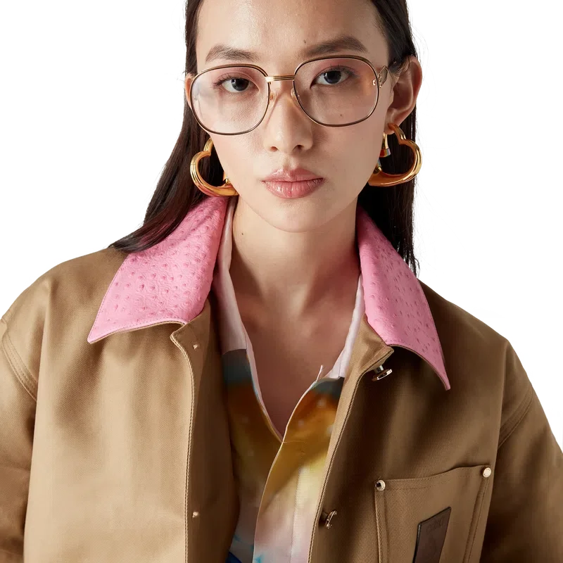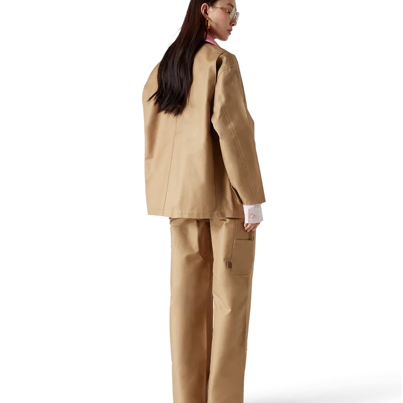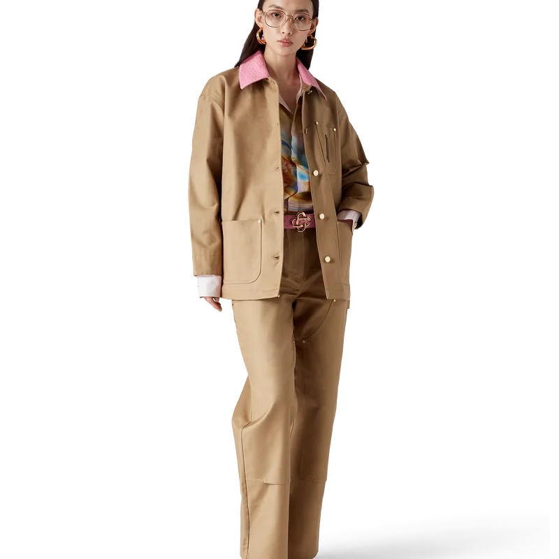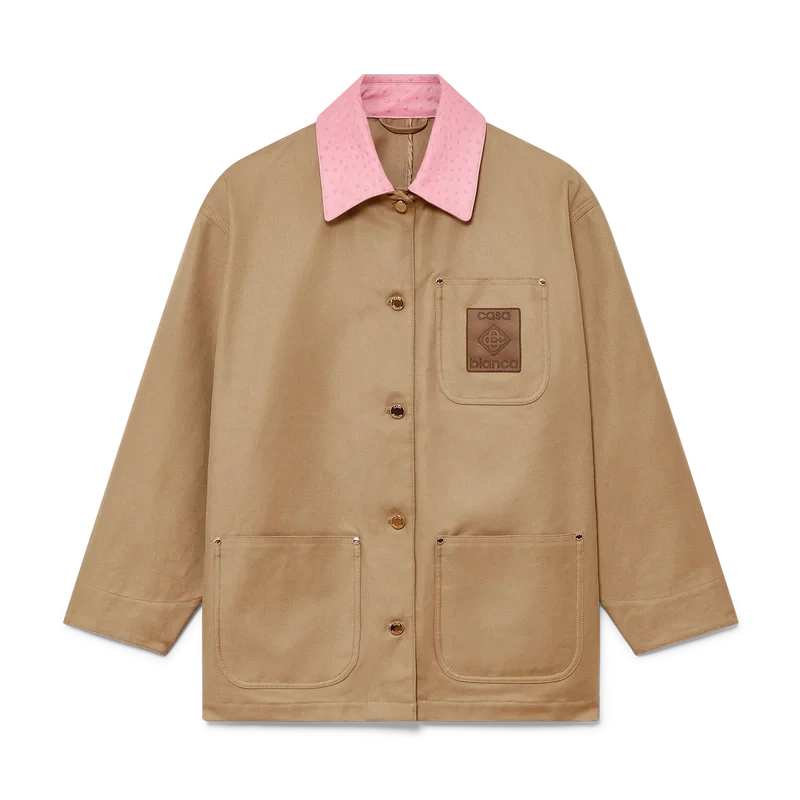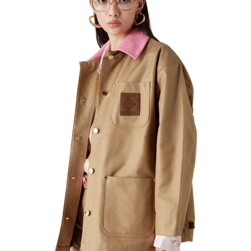 La veste de travail en coton est un modèle décontracté à manches longues, confectionné en coton drill. Elle est dotée d’un col contrasté, d’une poche poitrine avec un patch en cuir griffé, de poches plaquées sur le devant, d’une fermeture à boutons et de finitions plaquées or.