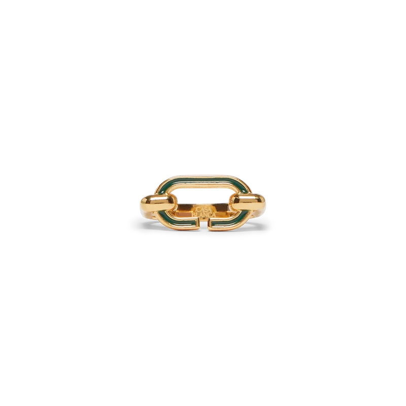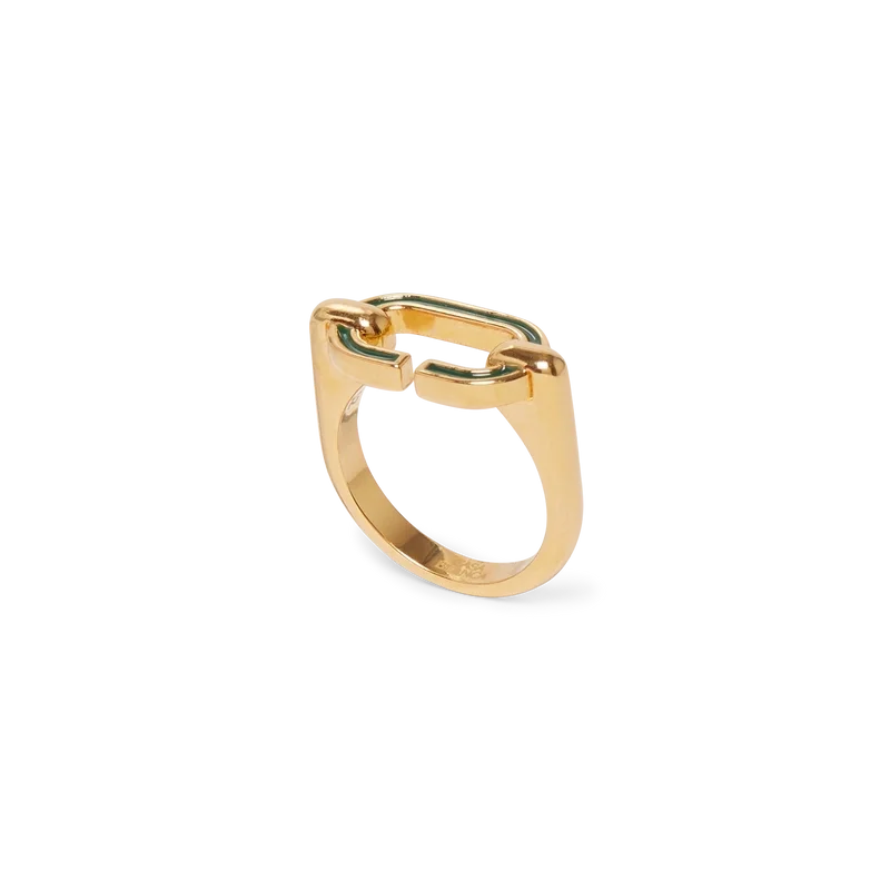 La bague C Link est un modèle minimaliste en laiton plaqué or et émail. Orné d’un « C » en émail vert peint à la main et d’un anneau plaqué or.