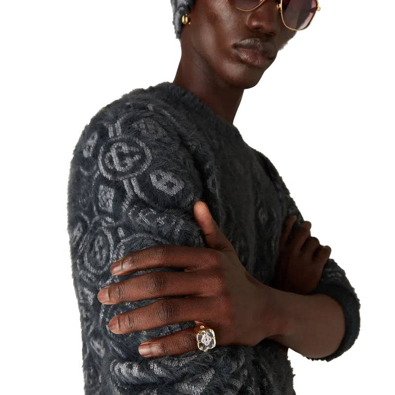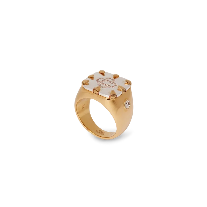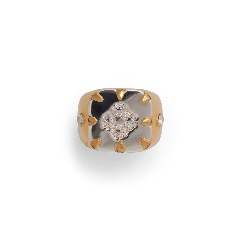 La bague cachet au logo Cc est fabriquée en laiton plaqué or, en argent et en cristaux. Elle est ornée du logo Cc entrelacé emblématique de la Maison sur la tête, rehaussé de cristaux, et de tiges avec un cristal de chaque côté.