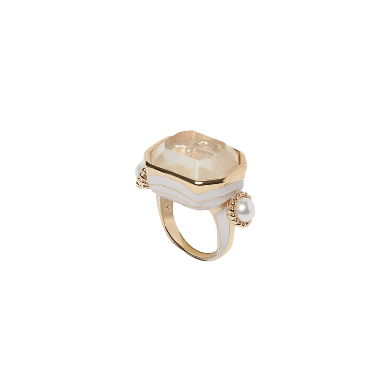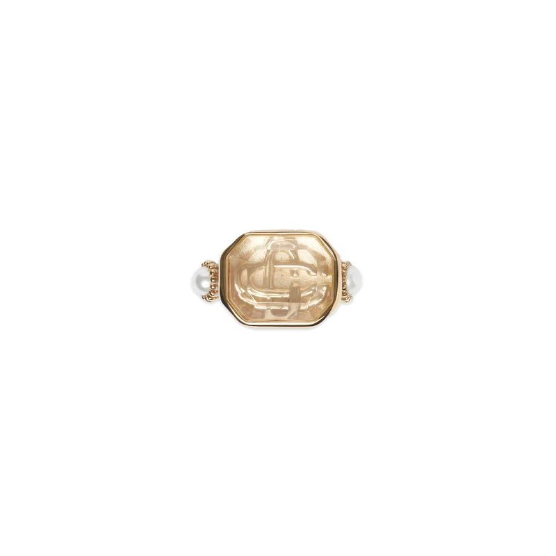 La bague Gradient arbore le logo en forme de diamant emblématique de la Maison, rehaussé de détails en perles.