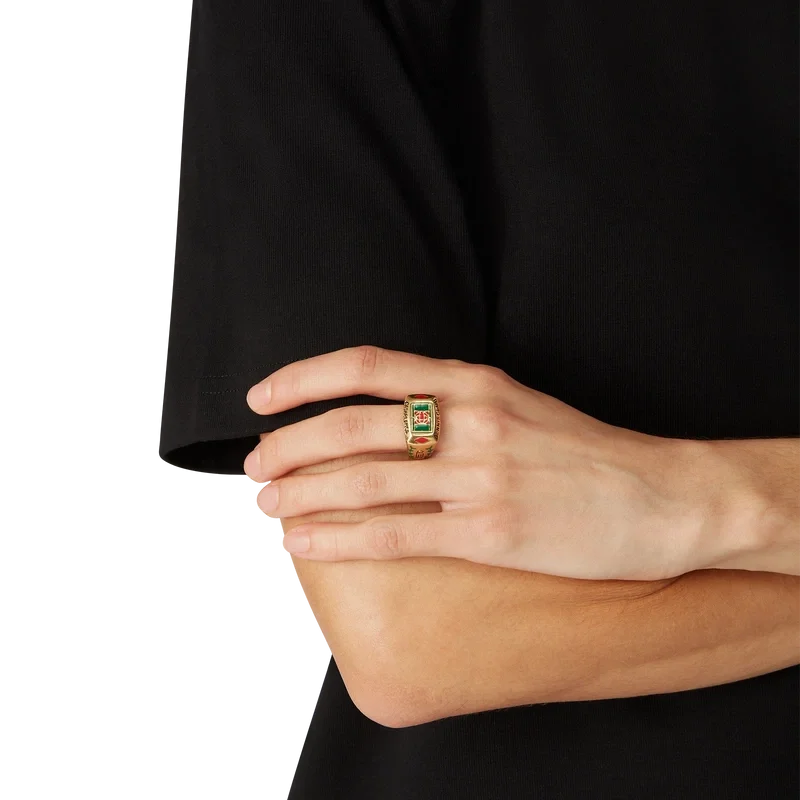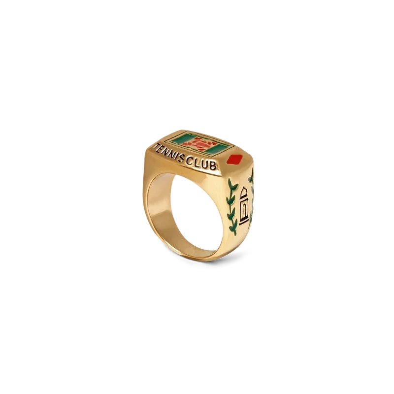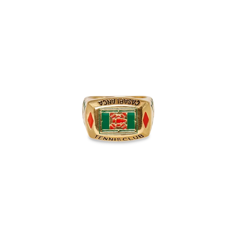 La bague Tennis Club est une pièce de notre collection principale inspirée de l’identité de la Maison, réalisée en laiton plaqué or et en émail peint à la main. Ornée de détails végétaux et du logo du Casablanca Tennis Club, cette pièce est livrée avec un coffret cadeau, une pochette de protection griffée et une brochure détaillée du produit.