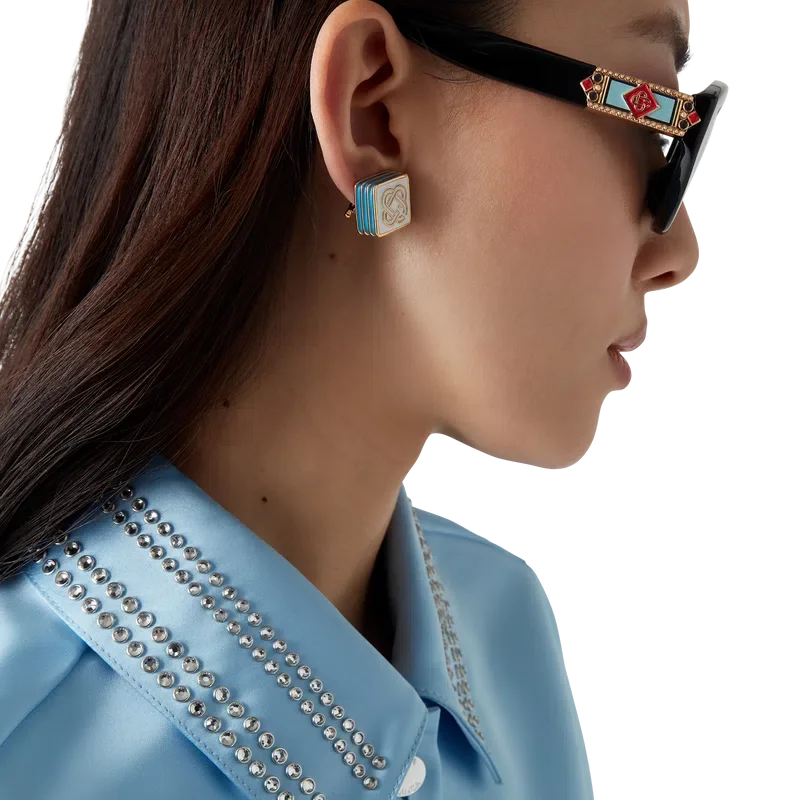 Les boucles d’oreilles à clous Monogram Logo sont une paire de boucles d’oreilles en forme de losange arborant le logo CC entrelacé de la Maison. Conçues pour les oreilles percées, elles sont réalisées en émail, en fausses perles et en laiton plaqué or. Elles sont dotées d’un fermoir papillon.