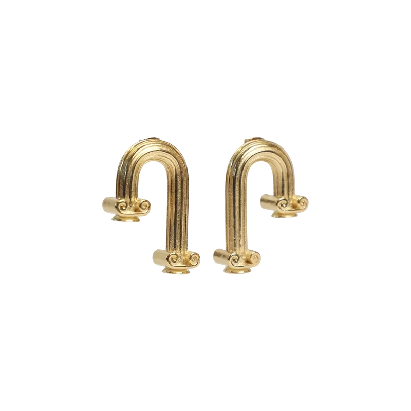 Les boucles d’oreilles « Arch Column » s’inspirent du thème de la Grèce antique de cette saison. Elles sont fabriquées à partir de colonnes grecques déformées en laiton plaqué or. Conçues pour les oreilles percées.