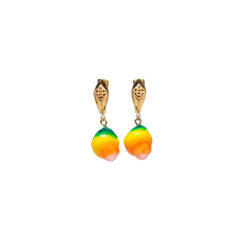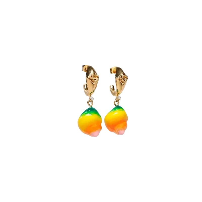 Les boucles d’oreilles pendantes en coquillage sont composées de cercles en laiton plaqué or ornés du logo CC entrelacé de la Maison et de mini-coquillages aux dégradés arc-en-ciel. Elles sont rehaussées de perles de verre.