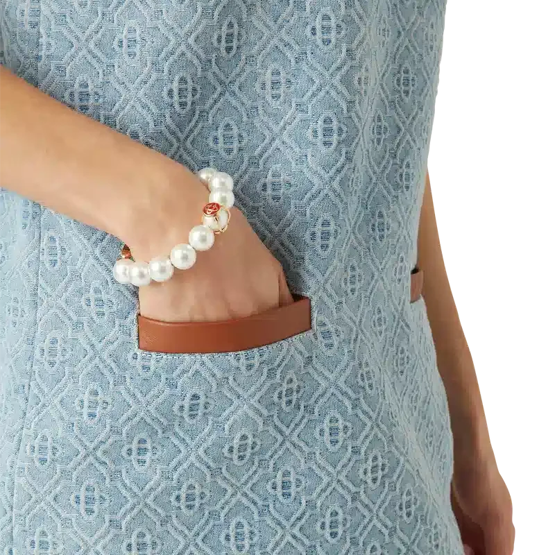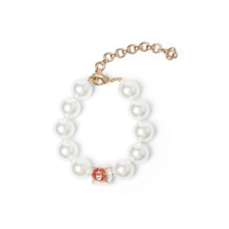 Le bracelet Caged Pearl est fabriqué en laiton plaqué or et en perles de verre synthétiques, et arbore le logo en forme de diamant emblématique de la maison. Doté d’une chaîne plaquée or et d’un fermoir mousqueton, ce bijou est livré avec un coffret cadeau, une pochette de protection griffée et un livret présentant les détails du produit.