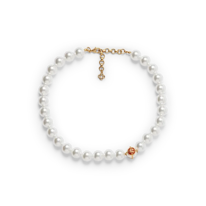 Le collier Caged Pearl est fabriqué en laiton plaqué or et en perles de verre synthétiques, et arbore le logo en forme de diamant emblématique de la maison. Doté d’une chaîne plaquée or et d’un fermoir mousqueton, ce bijou est livré avec un coffret cadeau, une pochette de protection griffée et une brochure détaillée du produit.