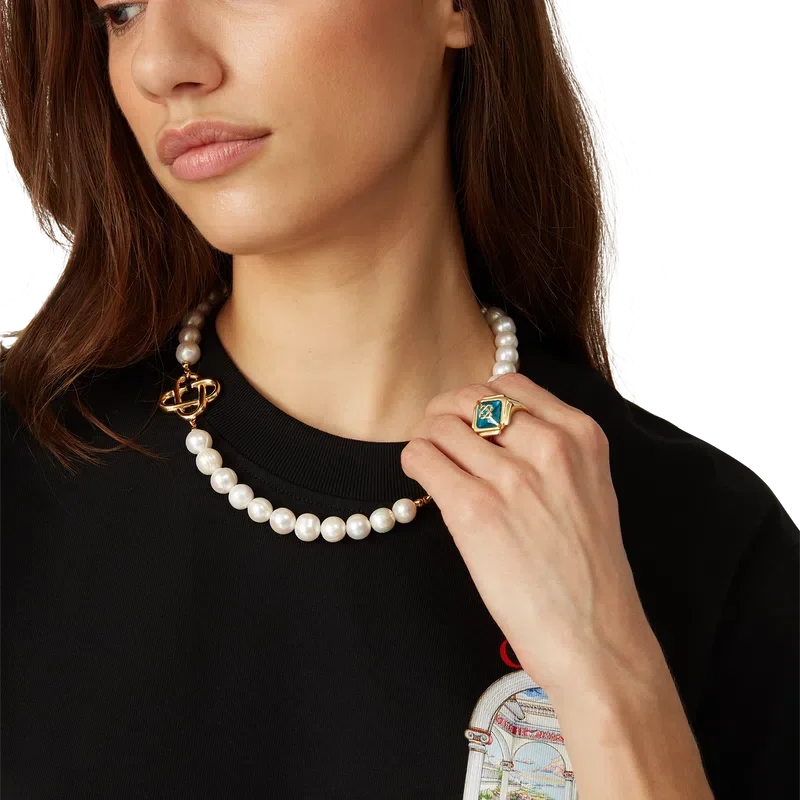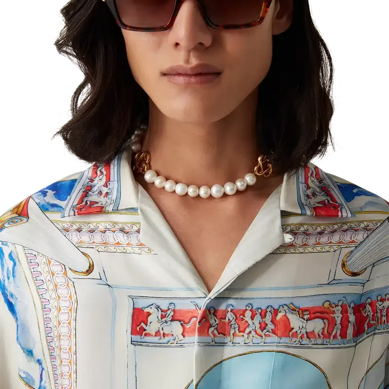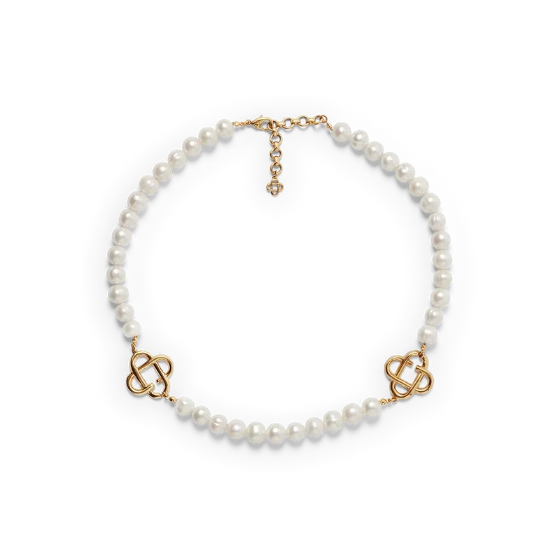 Le collier Logo à perles moyennes arbore l’insigne Casablanca autour du cou, avec un style conçu pour un ajustement parfait. Plaqué or 18 carats, ce collier est orné de 30 grosses perles d’eau douce.