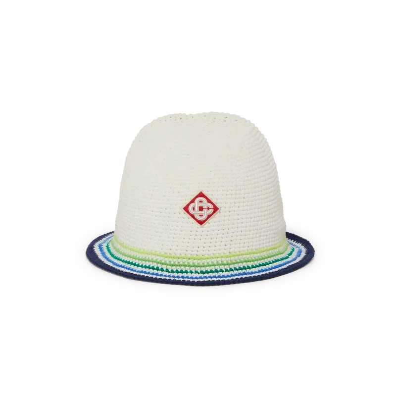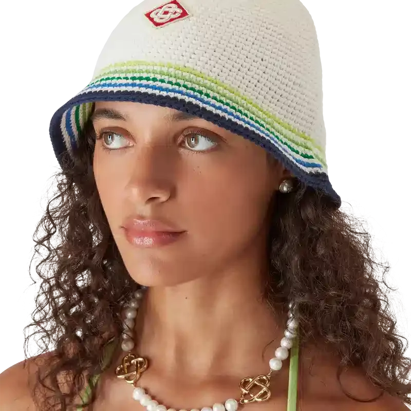 La casquette Beach Club est un modèle raffiné de style bob, confectionné en coton crocheté et orné du logo en losange emblématique de la Maison en son centre. Elle est agrémentée d’un bord rayé bleu, vert, jaune et blanc.